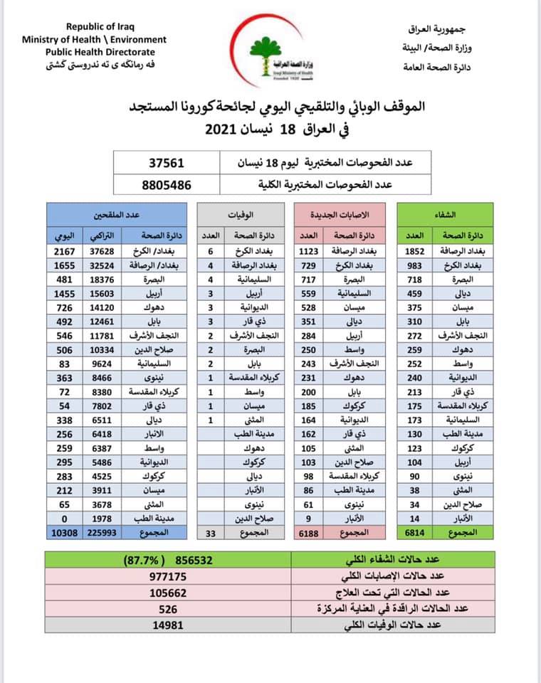وسجلت الوزارة اليوم 6188 اصابة جديدة بالفيروس، مقارنة بـ6552 اصابة يوم امس فيما سجلت اعداد الفوحصات الى 37561 مقارنة ب46299 يوم 15/4
