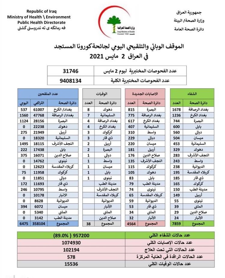 انخفاض اعداد المصابين بكورونا في العراق سببه تقليل الفحوصات ..شاهد جدول الاصابات
