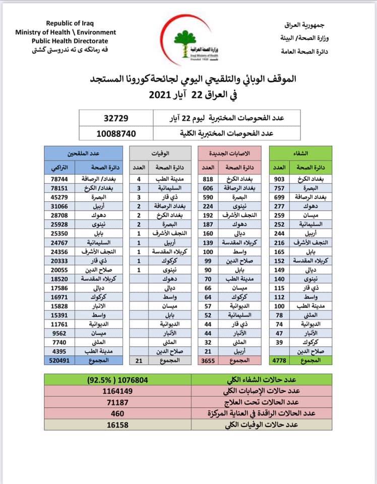 وقالت الوزارة في بيان، إن "كوادرها سجلت 3655 إصابة جديدة بفيروس كورونا، مقابل تماثل 4778 حالة للشفاء، و 21 وفاة بالفيروس".