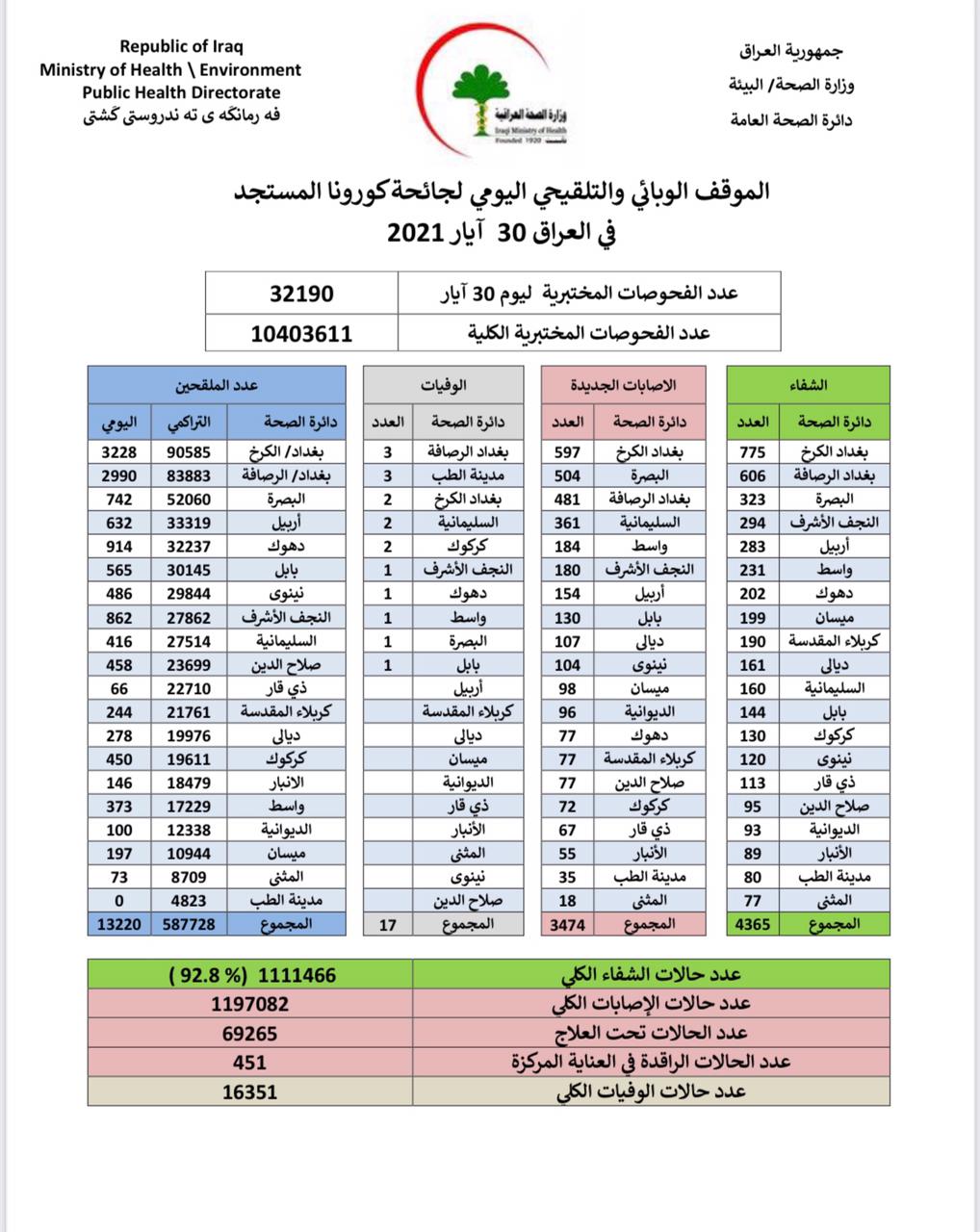 وقالت الوزارة في بيانها اليومي للموقف الوبائي ، إن "مختبراتها سجلت 3474 إصابة جديدة، و17 وفاة و4365 حالة شفاء".