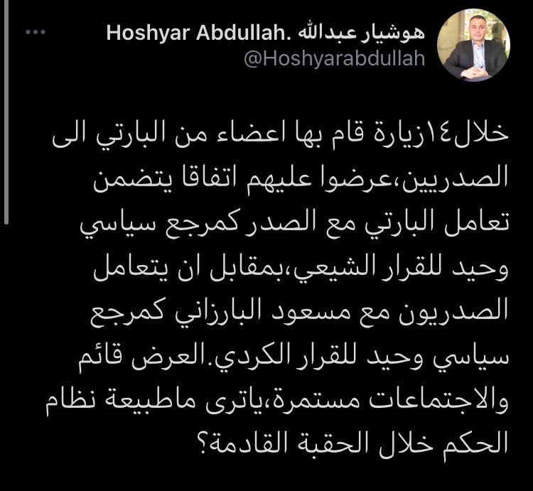 واوضح هوشيار عبد الله ان العرض الكردي لايزال قائم والاجتماعات مستمرة،متسائلا بقوله ياترى ماطبیعة نظام الحكم خلال الحقبة القادمة؟