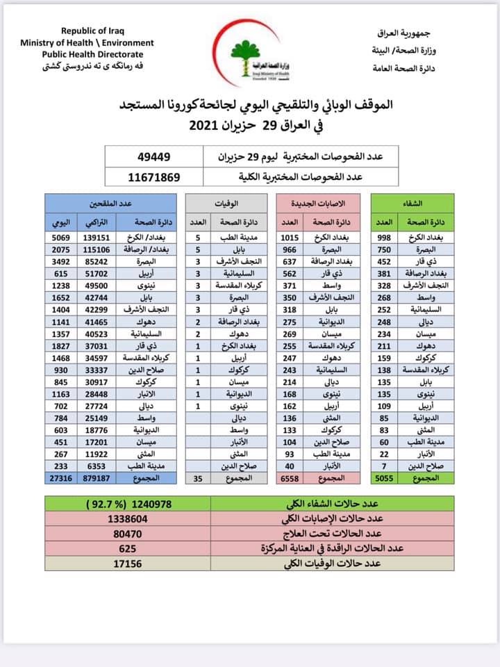 أعلنت وزارة الصحة والبيئة العراقية، يوم الثلاثاء، عن استمرار الارتفاع بوفيات وإصابات فيروس كورونا.