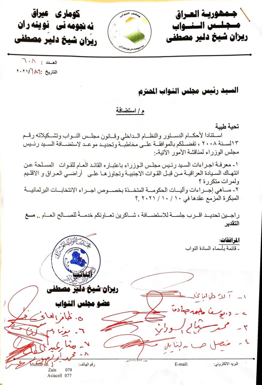 وبحسب وثائق حصلت عليها وكالة نون الخبرية، فأن عدداً من النواب وقعوا على وثيقة مقدمة إلى رئاسة مجلس النواب لغرض استضافة الكاظمي، من أجل بحث "انتهاكات السيادة العراقية من قبل القوات الأجنبية"، و "إجراءات الحكومة المتخذة بخصوص الانتخابات المقبلة".