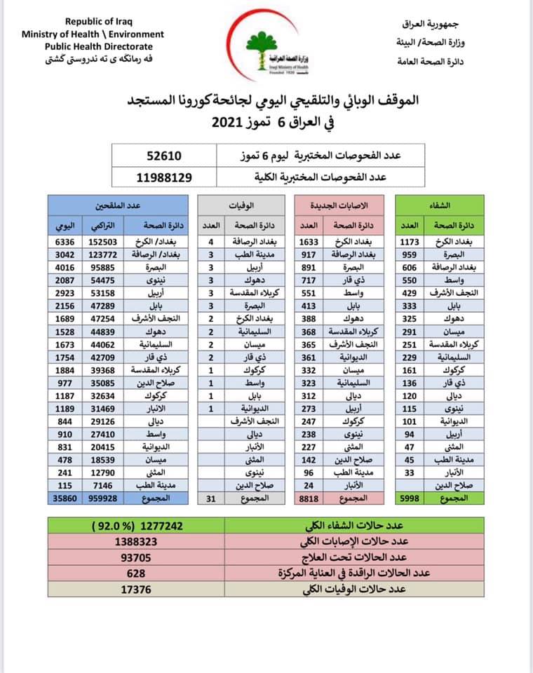وبلغ إجمالي الإصابات بفيروس كورونا في عموم العراق 1388323 اصابة، بينما ارتفع معدل الشفاء الكلي إلى 1277242، في حين بلغ إجمالي عدد الوفيات في العراق 17367 وفاة.