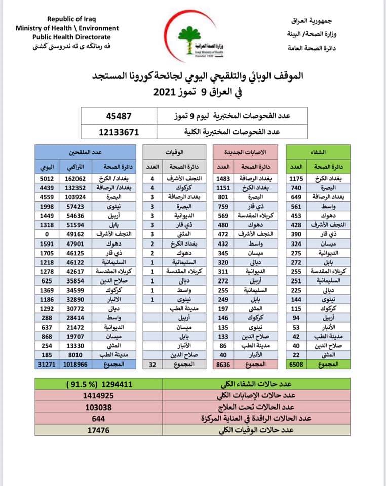 وقالت الوزارة في بيان ورد لوكالة نون الخبرية، إن "مختبراتها سجلت 8636 اصابة جديدة، و6508 حالة شفاء، اضافة الى 32 حالة وفاة.
