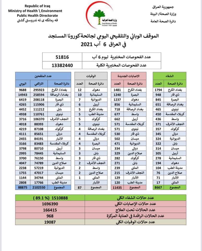 وقالت الوزارة في بيان تلقته وكالة نون الخبرية، انه "تم تسجيل 11.435 إصابة جديدة بفيروس كورونا المستجد، و8667 حالات شفاء من الفيروس التاجي، و87 حالة وفاة، خلال الـ 24 ساعة الماضية" مع الاشارة الى انخفاض عدد الفحوصات المختبرية اليومية المشخصة للفيروس نحو 9 الاف فحص، عن اعلى معدل فحص وصلت اليه الوزارة خلال الايام الماضية.
