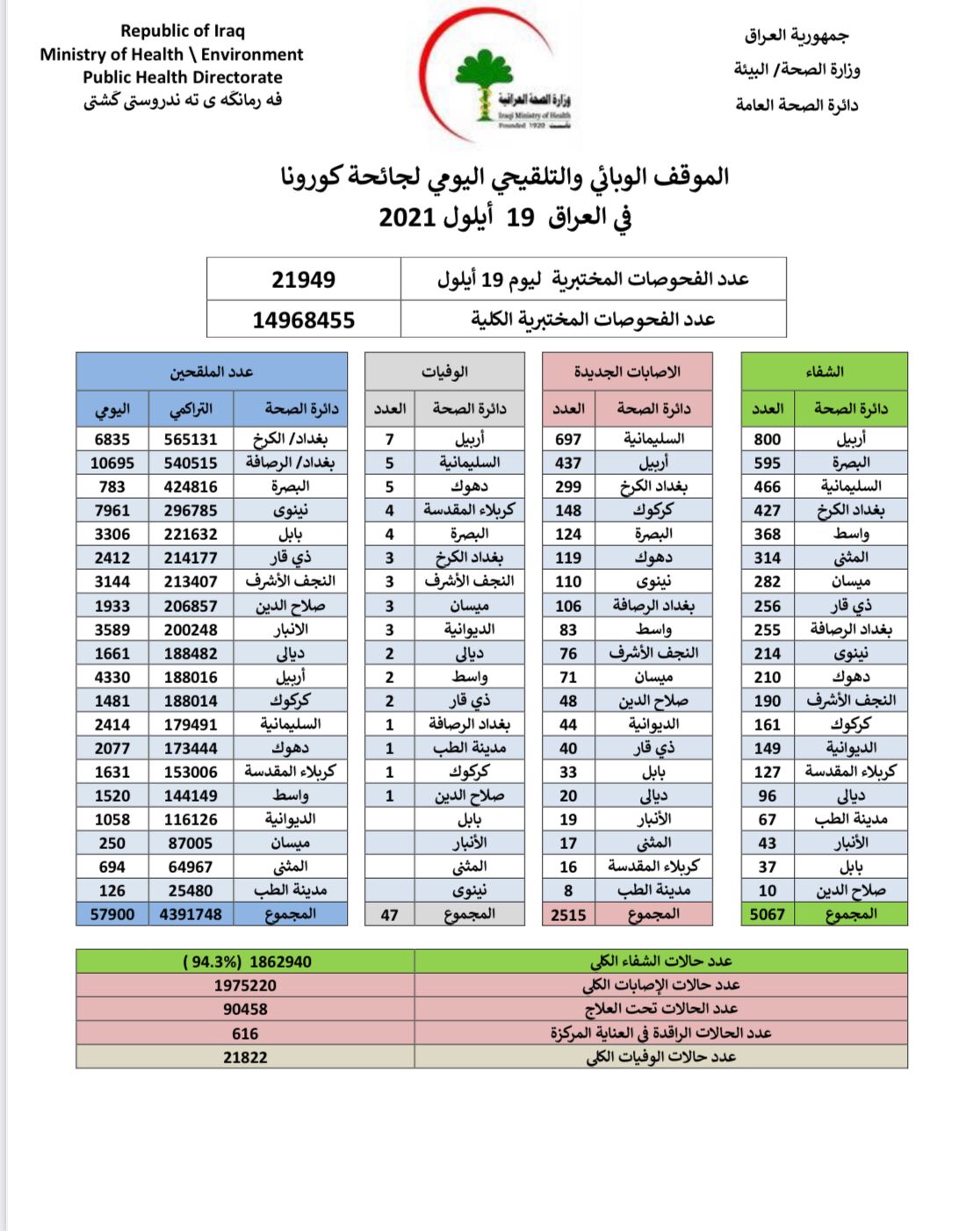 ارتفاع باعداد المصابين بكورونا بالعراق الأحد 19 ايلول 2021 1 دقيقة قراءة سياسية 3,616 مشاهدة أعلنت وزارة الصحة، اليوم الاحد، الموقف الوبائي والتلقيحي اليومي لجائحة كورونا في العراق. وقالت الوزارة في بيان،صحفي إنها "سجلت 2515 حالة إصابة، و 5067 حالة شفاء، و 47 حالة وفاة". التعليقات لا توجد تعليقات بعد. كن أول من يعلق! اسمك البريد الإلكتروني تعليق إرسال التعليق تعليقاتكم والموضوعات الأكثر تداولاً أكثر المواضيع قراءة عرض الكل الأكثر قراءة اليوم الأسبوع الشهر سنة 1 إقتصادية البورصة العراقية تسجل ارتفاعا جديدا للدولار في الأسواق 610 مشاهدة --منذ 6 ساعة 2 سياسية رويترز: إيران ربطت إنهاء الحرب بوقف الهجوم الإسرائيلي على حزب الله 379 مشاهدة --منذ 19 ساعة 3 اخبار محلية قافلة اغاثية قيمتها(3) مليار دينار تنطلق السبت:الشيخ عبد المهدي الكربلائي يقود حملة تبرع بالاموال لمساعدة الشعبين الايراني واللبناني 377 مشاهدة --منذ 8 ساعة 4 سياسية وفد إيراني يزور السودان ويعقد اجتماعات مغلقة 335 مشاهدة --منذ 20 ساعة 5 علمية الأنواء الجوية: أمطار مستمرة حتى يوم الأحد المقبل 318 مشاهدة --منذ 20 ساعة 1 إقتصادية "هرمز" يغلق المنافذ و "السوق السوداء" تشعل الدولار: هل انتهى سعر الـ145؟ 4256 مشاهدة --السبت 21 آذار 2026 2 منوعة نمر ينهش طفل في حديقة الزوراء والادارة ترد: الطفل تقرب منه وتحرش بالنمر 2174 مشاهدة --السبت 21 آذار 2026 3 أمن ومجتمع الأنواء الجوية تصدر توضيحاً بشأن حالة الطقس في بغداد 1781 مشاهدة --الأربعاء 25 آذار 2026 4 اخبار محلية محافظة كربلاء تعلن حالة التأهب القصوى وتعطل الدوام الخميس المقبل 1712 مشاهدة --الأثنين 23 آذار 2026 1 إقتصادية مساء الأربعاء.. تعرف على أسعار صرف الدولار في العراق 15731 مشاهدة --الأربعاء 18 آذار 2026 2 إقتصادية ارتفاع جديد بأسعار الدولار في العراق 15019 مشاهدة --الأثنين 02 آذار 2026 3 إقتصادية تراجع أسعار صرف الدولار في العراق 9592 مشاهدة --الأثنين 02 آذار 2026 4 إقتصادية الدينار ينتعش.. انخفاض أسعار صرف الدولار في العراق 8993 مشاهدة --الثلاثاء 10 آذار 2026 5 إقتصادية أسعار الدولار تواصل تحليقها في بورصات العراق 7545 مشاهدة --الخميس 05 آذار 2026 6 إقتصادية انخفاض جديد لأسعار الدولار مقابل الدينار في بغداد وأربيل 7384 مشاهدة --الأربعاء 11 آذار 2026 1 اخبار محلية خلال زيارته لمشروع صحن العقيلة.. ممثل السيد السيستاني يوعز بتخصيص مساحة (5) الاف متر على اسطح البنايات للزائرين 27146 مشاهدة --السبت 13 ايلول 2025 2 لقاءات منها الخاصة وفوق الكبرى والكبرى.. حيدر زيني.. طبيب أجرى (51) عملية في (28) ساعة متواصلة بمستشفى السفير 20789 مشاهدة --الثلاثاء 27 آيار 2025 3 اخبار محلية كربلاء تحدد تسعيرة "أمبير" المولدات الأهلية لشهر حزيران 2025 18461 مشاهدة --الثلاثاء 27 آيار 2025 4 تحقيقات بينَ زَخَّاتِ الرَّصاصِ وَدُموعِ الأهلِ.. قِصةُ شهيدٍ كَتبَتْ كربلاءُ خاتِمَتَهُ 17543 مشاهدة --الأربعاء 02 نيسان 2025 5 إقتصادية مساء الأربعاء.. تعرف على أسعار صرف الدولار في العراق 15731 مشاهدة --الأربعاء 18 آذار 2026 6 إقتصادية ارتفاع جديد بأسعار الدولار في العراق 15019 مشاهدة --الأثنين 02 آذار 2026 آخر التعليقات 1 الهاشمي التعليق : الطاقة النظيفة مقابل اليورانيم المخصب اكثر من المسموح وفق القوانين الدولية و اتفاقية الحد من ... الموضوع : إيران تطرح 5 شروط لإنهاء الحرب.. أبرزها التعويضات والسيادة على هرمز 2 محمد وهيب التعليق : كل خير وبركه ان شاء الله على العراق ... الموضوع : الأنواء الجوية تصدر توضيحاً بشأن حالة الطقس في بغداد 3 الهاشمي التعليق : ايران بحرب وما اعلنت حالة الطوارئ. الدستور حاكم على الجميع. بدلا من اجتماعا بلماني ل ... الموضوع : زيدان يوضح الآليات الدستورية والقانونية الواجب اتباعها في إعلان حالة الحرب 4 الهاشمي التعليق : بسم الله الرحمن الرحيم لَّمَا أَوْقَدُوا نَارًا لِّلْحَرْبِ أَطْفَأَهَا اللَّهُ ۚ وَيَسْعَوْنَ فِي الْأَرْضِ فَسَادًا ... الموضوع : توجيه عراقي عاجل: استوردوا البنزين 5 Hani التعليق : من المعيب جد