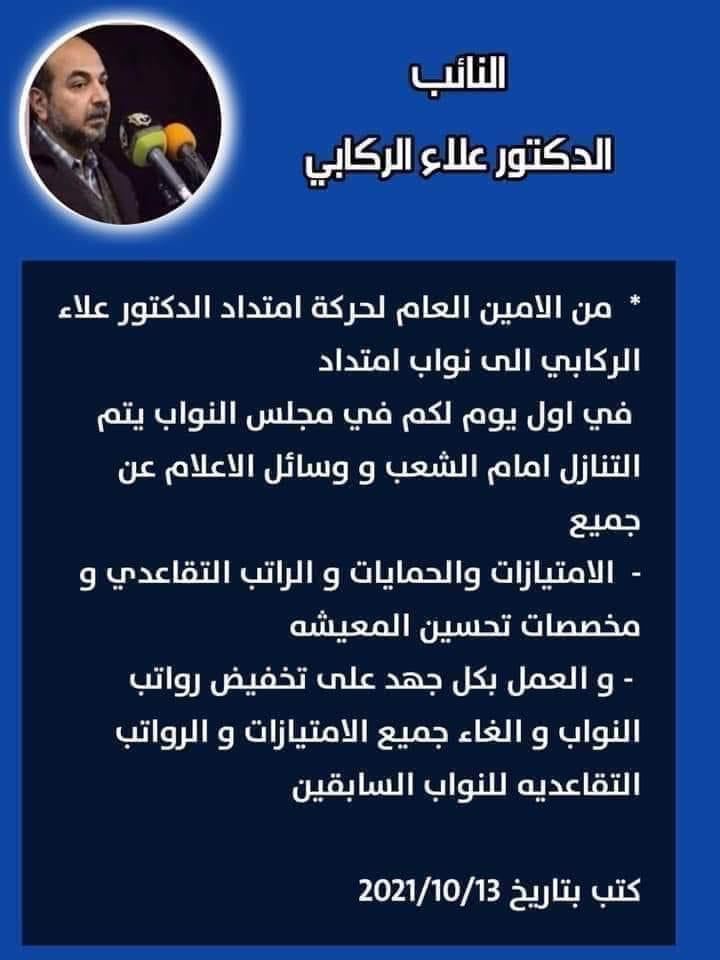 وكتب الركابي في تغريدة على تويتر، انه "من الامين العام لحركة امتداد الدكتور علاء الركابي الى نواب امتداد، في اول يوم لكم في مجلس النواب يتم التنازل امام الشعب ووسائل الاعلام عن جميع الامتيازات والحمايات والراتب التقاعدي ومخصصات تحسين المعيشة".