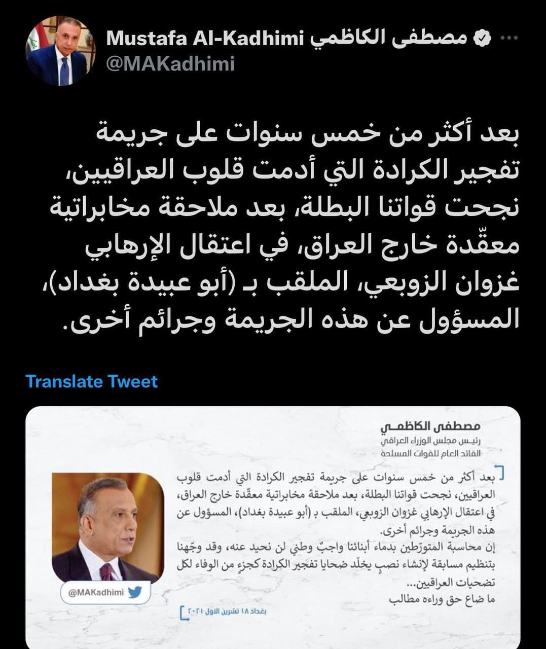 وبحسب بيان حصلت وكالة نون الخبرية عليه اليوم الاثنين 18/10 مانصه "بعد التوكل على الله وباشراف ومتابعة القائد العام للقوات المسلحة السيد مصطفى الكاظمي، تمكن الأبطال في جهاز المخابرات الوطني وبعملية بطولية استخبارية معقدة من القاء القبض على المتهم ( غزوان الزوبعي) الملقب ب ( ابو عبيدة بغداد ) في احدى الدول وهو من أبرز المطلوبين للقضاء العراقي حيث نفذ هذا الارهابي العديد من العمليات الاجرامية ضد ابناء الشعب العراقي والقوات الامنية العراقية وكان ابرزها: