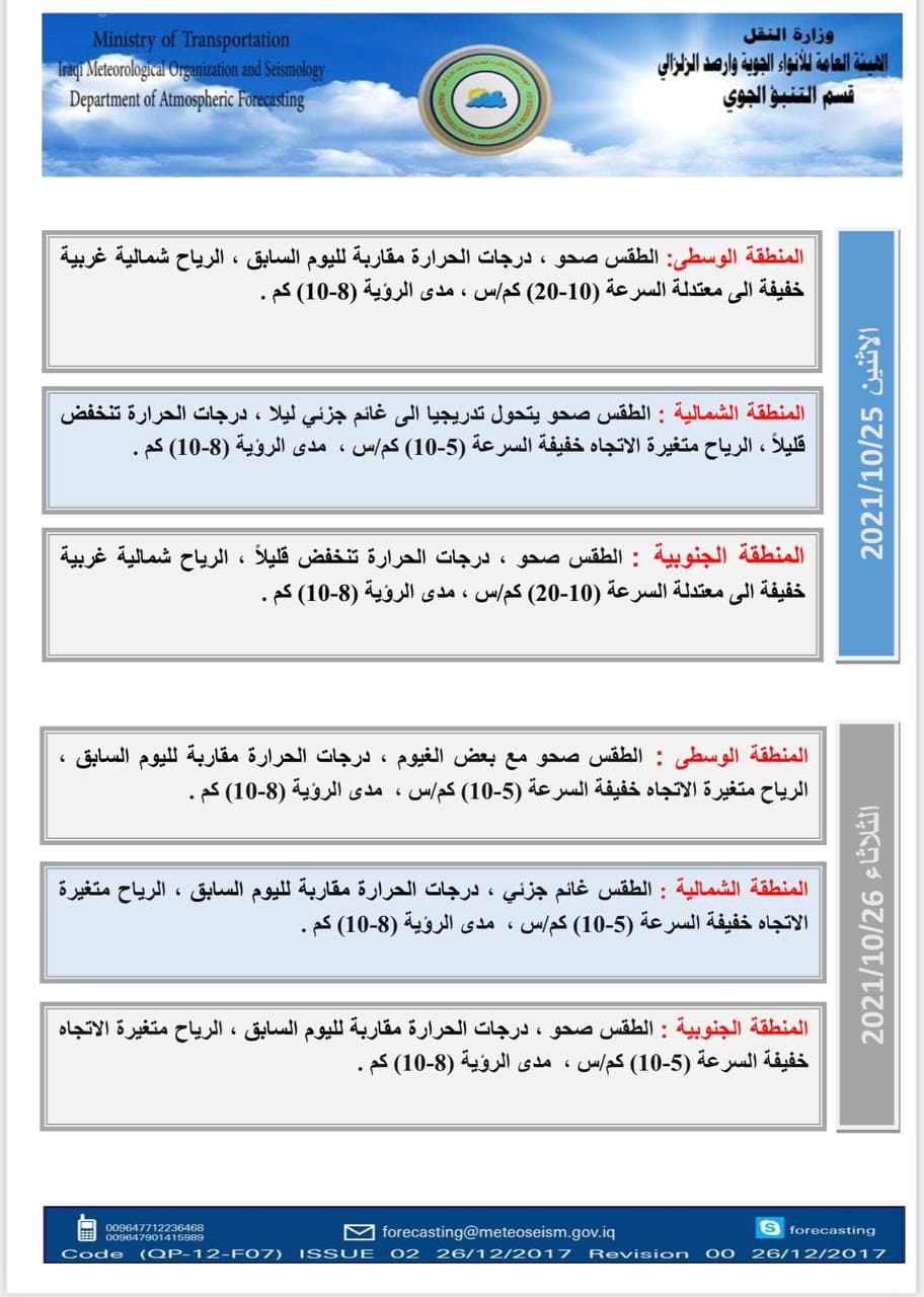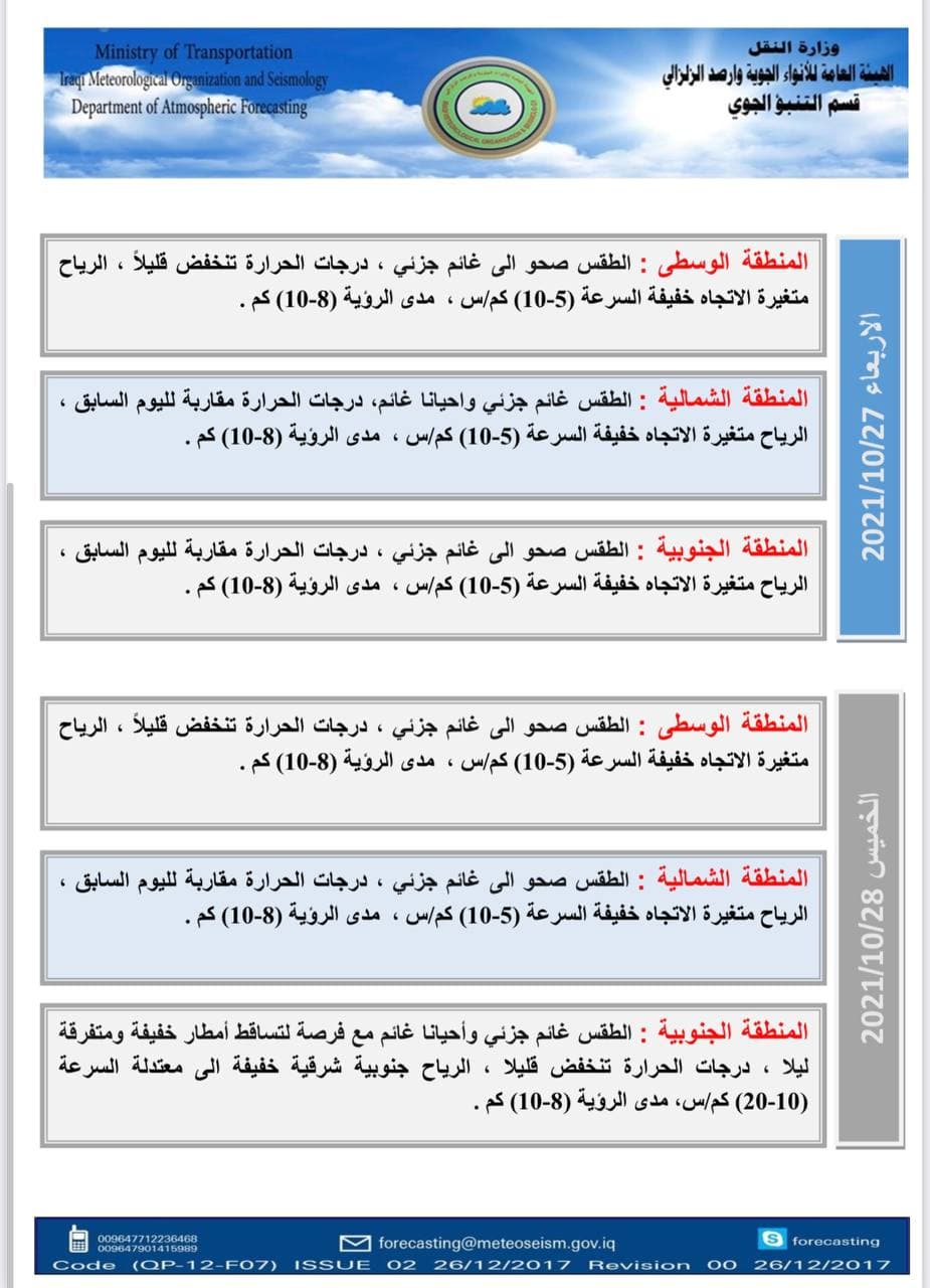 واوضح البيان، أن "طقس يوم الأربعاء سيكون صحواً الى غائم جزئي في جميع مناطق البلاد، أما درجات الحرارة فستكون مقاربة لليوم السابق في المنطقة الشمالية والجنوبية، بينما ستنخفض قليلاً في المنطقة الوسطى، فيما ستكون الرياح متغيرة الاتجاه خفيفة السرعة (5-10)كم/س في جميع مناطق البلاد".