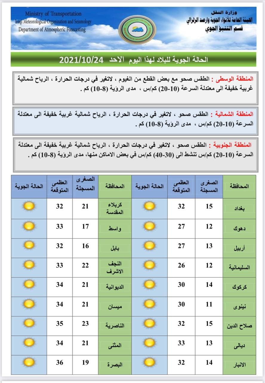 وذكرت الهيئة في بيان صحفي، أن "طقس يوم غد الاثنين سيكون صحواً ويتحول تدريجياً الى غائم جزئي ليلاً في المنطقة الشمالية، أما درجات الحرارة فستكون مقاربة لليوم السابق في المنطقة الوسطى، فيما ستنخفض قليلاً في الأقسام الشمالية والجنوبية من البلاد، والرياح ستكون شمالية غربية خفيفة الى معتدلة السرعة (20-10) كم/س في الأقسام الوسطى والجنوبية، ومتغيرة الاتجاه خفيفة السرعة(10-5 )كم/س في القسم الشمالي، اما درجات الحرارة فستسجل المحافظات بغداد والانبار وبابل وكربلاء المقدسة وصلاح الدين 31 درجة، فيما ستسجل محافظة البصرة 34 درجة".