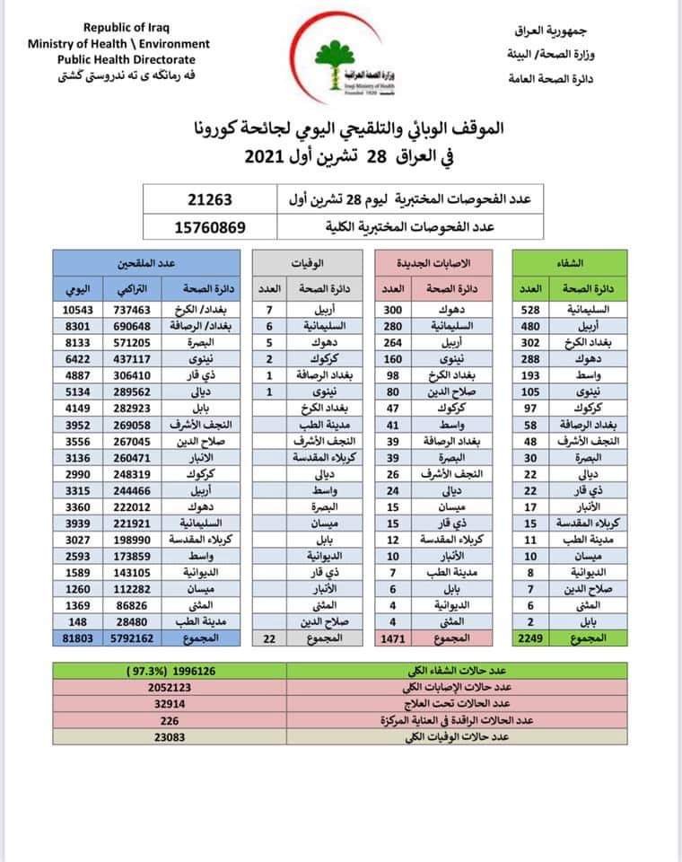 اعلنت وزارة الصحة، اليوم الاحد، الموقف الوبائي لفيروس كورونا في عموم البلاد.
