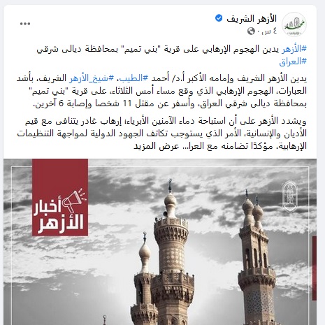 أدان الجامع الأزهر وإمامه أحمد الخطيب "بأشد العبارات" الهجوم الإرهابي الذي وقع مساء أمس، على قرية "بني تميم" في محافظة ديالى.