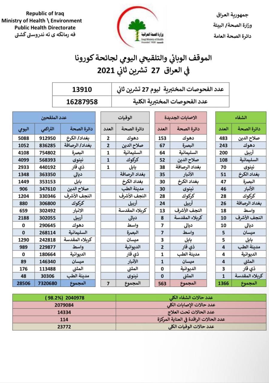 وأظهر جدول الموقف الوبائي، تماثل 1366 مريضاً إلى الشفاء التام، بينما أصيب 536 شخصاً بالفيروس وتوفي سبعة أشخاص، في حين بلغ عدد الملقحين في عموم البلاد 28506 أشخاص خلال الساعات الاربع والعشرين الماضية.