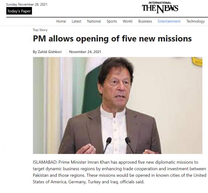 ذكرت صحيفة "انترناشونال نيوز" الباكستانية الرسمية، نقلاً عن رئاسة وزراء بلادها، إعلانها عن قرب إفتتاح خمس بعثات دبلوماسية جديدة بغرض تطوير ما وصفتها بـ "التعاملات الديناميكية" في مدن معروفة بالعراق وتركيا وألمانيا والولايات المتحدة الأمريكية.