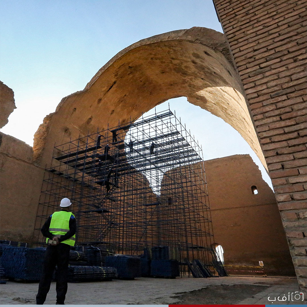 صور لأعمال الترميم الجارية على قوس المدائن، المعروف أيضا باسم "طق كسرة" أو "قوس خسرو"، في موقع قطسيفون القديم، بالقرب من مدينة المدائن في وسط العراق.