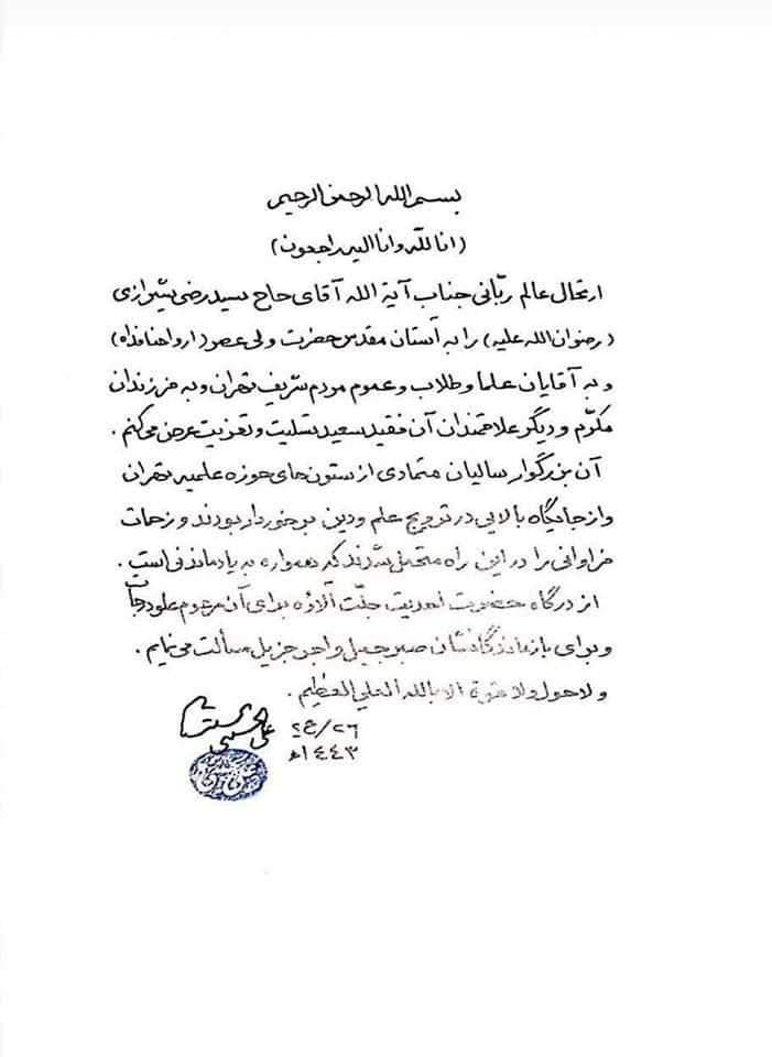 نعزي ولي العصر والزمان أرواحنا فداه والسادة العلماء والطلبة وعموم أهالي مدينة طهران الشرفاء برحيل العالم الرباني سماحة آية الله الحاج السيد رضي الشيرازي رضوان الله عليه، كما نعزي وذويه المكرمين وجميع محبي الفقيد.