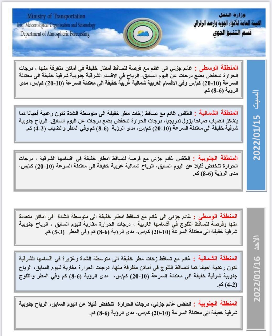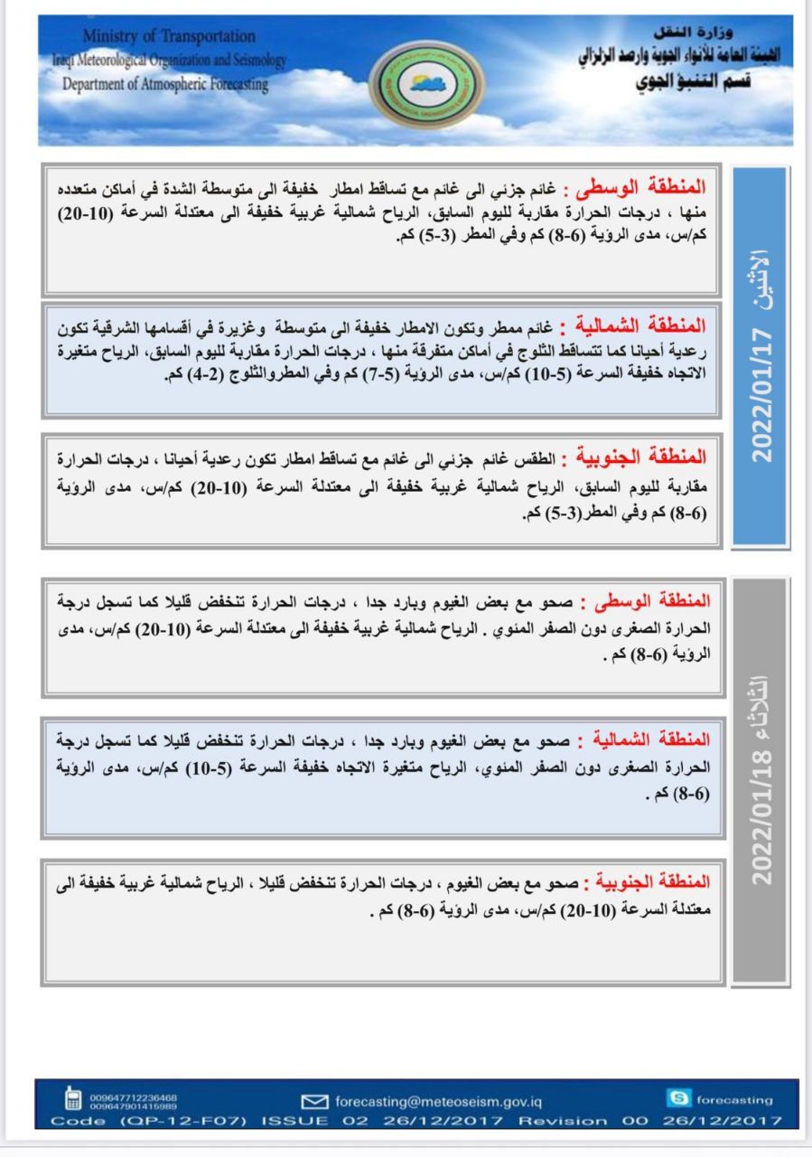 واشار الى، أن "طقس يوم الاثنين، في المنطقتين الوسطى والجنوبية سيكون غائماً جزئي الى غائم مع تساقط مطر خفيفة الى متوسطة الشدة، بينما سيكون طقس المنطقة الشمالية غائماً ممطر وتكون الامطار خفيفة الى متوسطة وغزيرة في اقسامها الشرقية وتكون احيانا رعدية كما تتساقط الثلوج في اماكن متفرقة منها، بينما ستكون درجات الحرارة مقاربة لليوم السابق في عموم البلاد".
