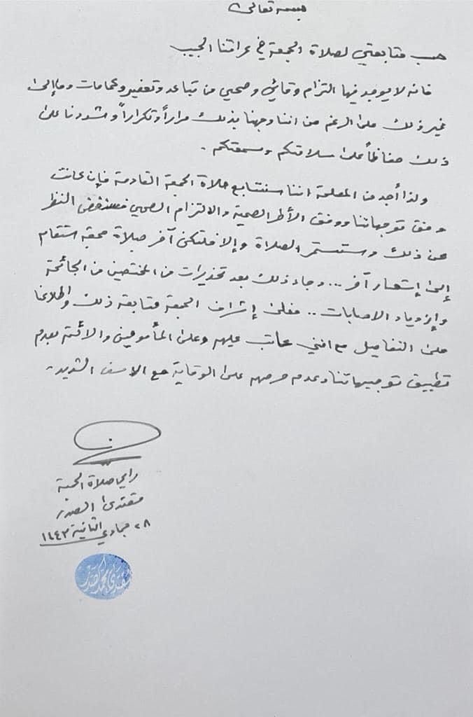 و"عكس ذلك"، وفق وثيقة مكتوبة بخط يد الصدر، فأنه (الصدر) سيوجه بالغائها حتى اشعار اخر، وذلك بعد تحذيرات المختصين من الجائحة وازدياد الاصابات.