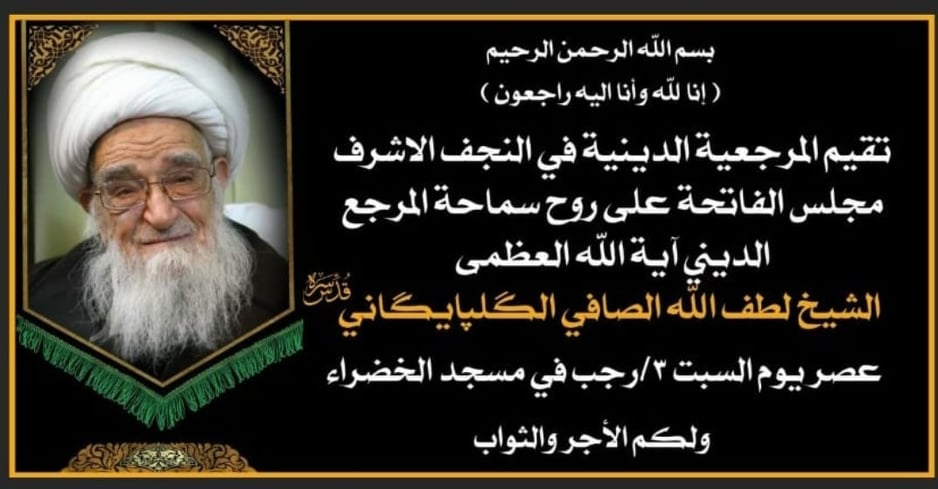 اعلنت المرجعية الدينية بالنجف الاشرف انها ستقيم مجلس الفاتحة على روح المرجع الراحل الشيخ لطف الله الصافي الگلبايگاني