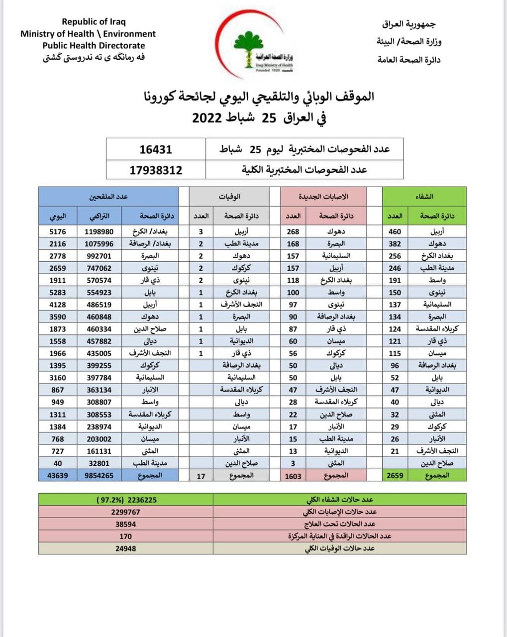 ارتفاع عدد اصابات ووفيات كورونا في العراق الجمعة 25 شباط 2022 1 دقيقة قراءة سياسية 2,882 مشاهدة التعليقات لا توجد تعليقات بعد. كن أول من يعلق! اسمك البريد الإلكتروني تعليق إرسال التعليق تعليقاتكم والموضوعات الأكثر تداولاً أكثر المواضيع قراءة عرض الكل الأكثر قراءة اليوم الأسبوع الشهر سنة 1 إقتصادية بعد هدوء في عاصفة الأسعار.. قفزة جديدة للدولار أمام الدينار العراقي 912 مشاهدة --منذ 7 ساعة 2 اخبار محلية مشروع خدمي جديد في كربلاء لربط الأحياء السكنية وتحسين حركة السير 858 مشاهدة --منذ 22 ساعة 3 إقتصادية الدولار يستقر فوق سعره الرسمي في العراق 745 مشاهدة --منذ 9 ساعة 4 سياسية طهران تتوعد باغتيال نتنياهو 536 مشاهدة --منذ 13 ساعة 5 سياسية تعرض سجن المطار "الكرخ المركزي" لست ضربات ..والعدل تعلن انه يأوي سجناء إرهابيين شديدي الخطورة 395 مشاهدة --منذ 21 ساعة 1 إقتصادية الدينار ينتعش.. انخفاض أسعار صرف الدولار في العراق 7949 مشاهدة --الثلاثاء 10 آذار 2026 2 إقتصادية انخفاض جديد لأسعار الدولار مقابل الدينار في بغداد وأربيل 6329 مشاهدة --الأربعاء 11 آذار 2026 3 إقتصادية الدولار يعاود الارتفاع أمام الدينار العراقي 1762 مشاهدة --الخميس 12 آذار 2026 4 إقتصادية مساء السبت.. تعرف على أسعار صرف الدولار أمام الدينار العراقي 1256 مشاهدة --السبت 14 آذار 2026 1 إقتصادية ارتفاع جديد بأسعار الدولار في العراق 14024 مشاهدة --الأثنين 02 آذار 2026 2 إقتصادية مساء السبت.. تعرف على أسعار صرف الدولار مع إغلاق الأسواق في العراق 11108 مشاهدة --السبت 21 شباط 2026 3 إقتصادية مساء السبت.. تعرف على أسعار صرف الدولار في العراق 10406 مشاهدة --السبت 14 شباط 2026 4 إقتصادية تراجع أسعار صرف الدولار في العراق 8599 مشاهدة --الأثنين 02 آذار 2026 5 إقتصادية الدينار ينتعش.. انخفاض أسعار صرف الدولار في العراق 7949 مشاهدة --الثلاثاء 10 آذار 2026 6 إقتصادية أسعار الدولار تواصل تحليقها في بورصات العراق 6540 مشاهدة --الخميس 05 آذار 2026 1 اخبار محلية خلال زيارته لمشروع صحن العقيلة.. ممثل السيد السيستاني يوعز بتخصيص مساحة (5) الاف متر على اسطح البنايات للزائرين 26171 مشاهدة --السبت 13 ايلول 2025 2 لقاءات *محمد الصواف: عدسة توثق الحقيقة وتنقل قصص الإنسانية في قلب الأزمات* 20024 مشاهدة --الأحد 30 آذار 2025 3 لقاءات منها الخاصة وفوق الكبرى والكبرى.. حيدر زيني.. طبيب أجرى (51) عملية في (28) ساعة متواصلة بمستشفى السفير 19721 مشاهدة --الثلاثاء 27 آيار 2025 4 اخبار محلية كربلاء تحدد تسعيرة "أمبير" المولدات الأهلية لشهر حزيران 2025 17428 مشاهدة --الثلاثاء 27 آيار 2025 5 تحقيقات بينَ زَخَّاتِ الرَّصاصِ وَدُموعِ الأهلِ.. قِصةُ شهيدٍ كَتبَتْ كربلاءُ خاتِمَتَهُ 16575 مشاهدة --الأربعاء 02 نيسان 2025 6 إقتصادية ارتفاع جديد بأسعار الدولار في العراق 14024 مشاهدة --الأثنين 02 آذار 2026 آخر التعليقات 1 الهاشمي التعليق : الحمد لله رب العالمين بسم الله الرحمن الرحيم أَلَمْ تَرَ كَيْفَ ضَرَبَ اللَّهُ مَثَلًا كَلِمَةً ... الموضوع : وكالة "فارس": زوجة المرشد الراحل علي خامنئي ما تزال على قيد الحياة 2 الهاشمي التعليق : الحمد لله رب العالمين بسم الله الرحمن الرحيم أَلَمْ تَرَ كَيْفَ ضَرَبَ اللَّهُ مَثَلًا كَلِمَةً ... الموضوع : وكالة "فارس": زوجة المرشد الراحل علي خامنئي ما تزال على قيد الحياة 3 الهاشمي التعليق : الحمد لله رب العالمين بسم الله الرحمن الرحيم أَلَمْ تَرَ كَيْفَ ضَرَبَ اللَّهُ مَثَلًا كَلِمَةً ... الموضوع : وكالة "فارس": زوجة المرشد الراحل علي خامنئي ما تزال على قيد الحياة 4 الهاشمي التعليق : بسم الله الرحمن الرحيم ﴿ سَابِقُوا إِلَىٰ مَغْفِرَةٍ مِّن رَّبِّكُمْ وَجَنَّةٍ عَرْضُهَا كَعَرْضِ السَّمَاءِ وَالْأَرْضِ ... الموضوع : مكتب السيد السسيتاني في لبنان يطلق مبادرة إنسانية لدعم الأعمال الطبية لمرضى النازحين المتعففين 5 الهاشمي التعليق : نقدم لسيدي صاحب الزمان اخلص التعازي بمناسبة ذكرى استشهاد امام المتقين عليه السلام و نعزي ... الموضوع : المرجع الاعلى اية الله الع