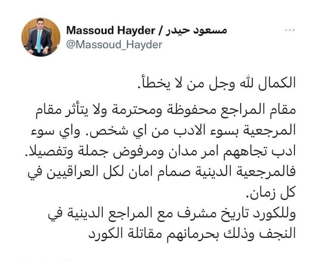 وقال حيدر في تدوينة اطلعت عليها وكالة نون (28 آذار 2022)، إن "الكمال لله وجل من لا يخطأ"، وأضاف أن "مقام المراجع محفوظة ومحترمة ولا يتأثر مقام المرجعية بسوء الأدب من اي شخص".