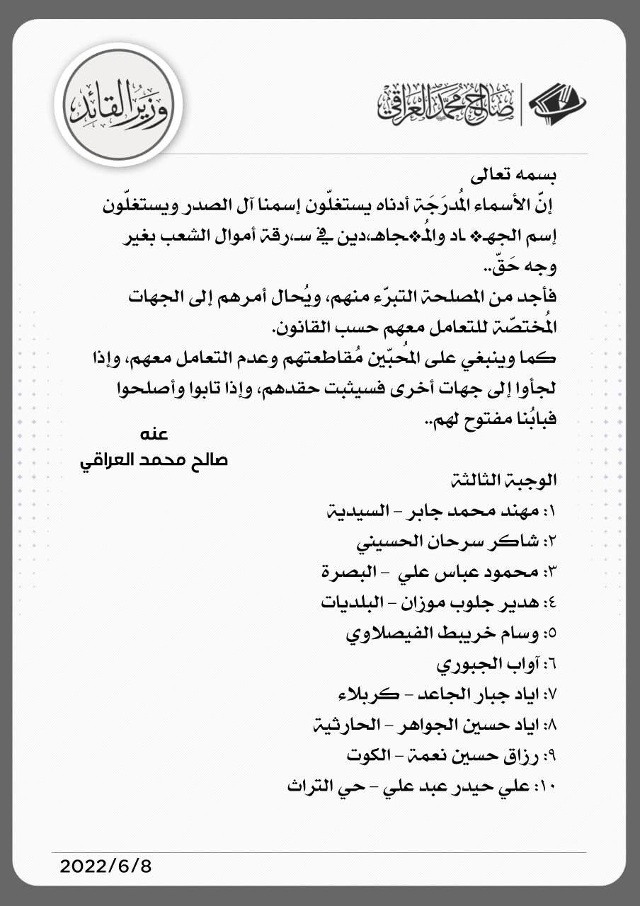 أعلن زعيم التيار الصدري مقتدى الصدر، اليوم الاربعاء، التبرأ من 10 أشخاص يستغلّون اسم آل الصدر ويستغلون اسم الجهاد والمجاهدين في سرقة أموال الشعب بغير وجه حَقّ"
