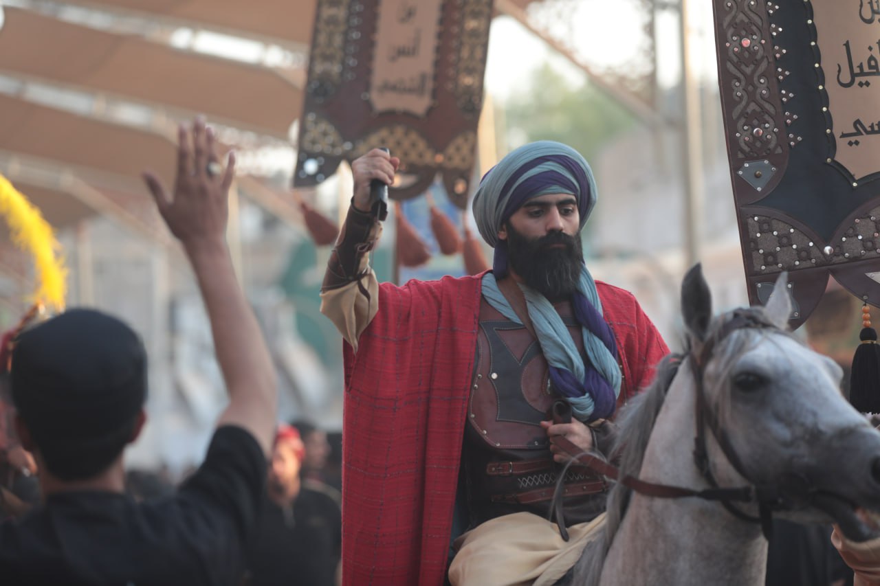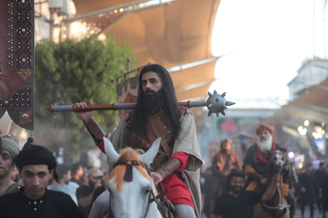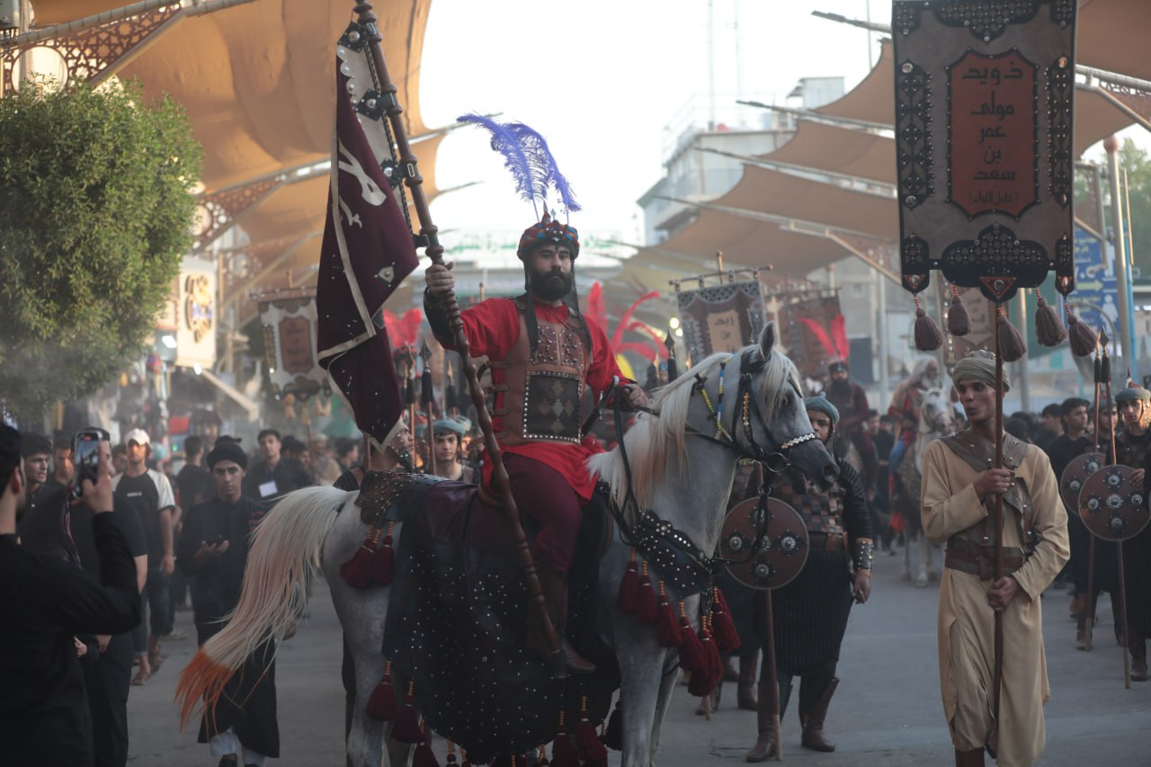 كما في كل عام يحرص الكربلائيون عبر مواكبهم وهيئاتهم الحسينية على تجسيد التحشيد العسكري لجيش الملعون يزيد وقياداته الظالمة التي لم ترع في الله حرمة لبيت رسوله الكريم، فنزلت مواكب التشابيه التي تجسد تلك الحوادث قبل وقوع المعركة تسير في شوارع المدينة القديمة قرب المرقدين الشريفين، يرتدي فيها الممثلون ملابس الحرب القديمة ويحملون من اكسسوارات المعركة مثل السيوف والخناجر والطبول والدروع والقلنسوات ما يولد لدى الناظر اجواء معركة الطف الخالدة.