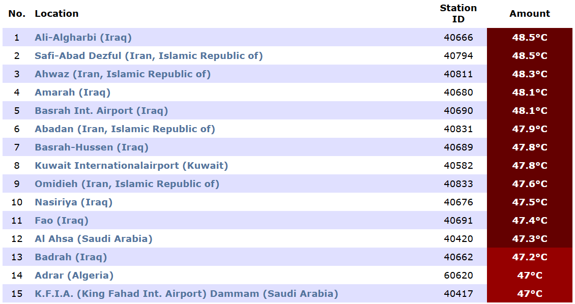 وأوضح جدول نشرته المحطة، اليوم الاحد وتابعته وكالة نون الخبرية فإن "المدن العراقية، وعلى رأسها مدينة علي الغربي جنوب البلاد تصدرت لائحة الأعلى بدرجات الحرارة بدرجة 48.5 درجة سيليزية، اضافة الى مدن جنوبية اخرى مثل ذي قار التي والكوت والبصرة".