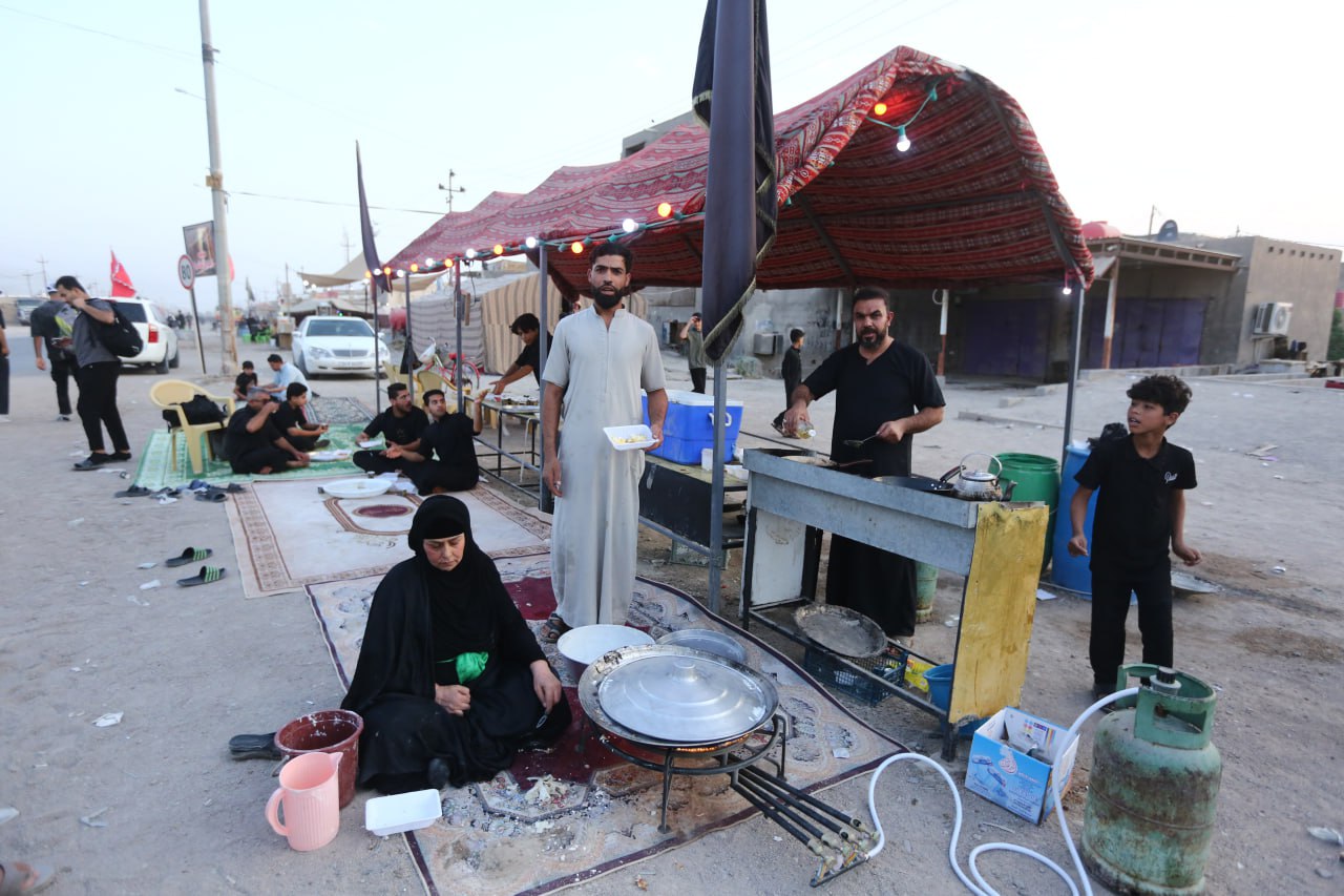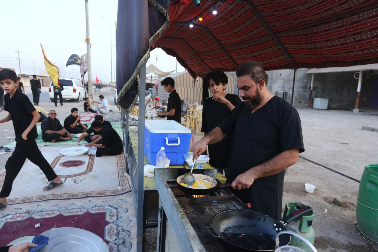وقف المعلم الجامعي "حسين علي سلمان العبودة" من منطقة الجراحي قرب معمل الورق في البصرة بموكب "البتول الطاهرة" ينادي على الزائرين عند الساعة الخامسة فجرا ليتناولوا طعام الفطور المكون من خبز "السياح" والبيض والمخلمة، وتربعت السيدة الجليلة "ام نعيم" على الأرض لتصنع الخبز الذي تخصص به اهل المحافظات الجنوبية، هذه الخدمة في موكب واحد من مواكب مدينة باكملها، ويوضح الامر لوكالة نون الخبرية بالقول ان" الموكب تأسس وافتتح على يد عائلتنا بين اخوتي وأبناء عمومتي وابنائنا وابنائهم، وتولدت الفكرة بعد سقوط النظام المباد بعد العام (2003)، وكوننا نسكن على طريق "المشاية" وشاهدنا الحاجة الماسة لمساعدتهم وتقديم الطعام، والماء، والمأوى، والسكن، والحمامات، والخدمة لهم، ومنذ ذلك الحين نقدم مختلف أنواع الخدمات لهم ونأويهم للمبيت في بيوتنا، والانفاق على الموكب يكون من خلال جمع مبالغ شهرية على مدار السنة ويعرف كل عضو بالموكب ما يترتب عليه في صندوق خاص للموكب يفتح عند اقتراب الزيارة الاربعينية وتقديم الخدمة، ووجدنا في طريق الحسين (عليه السلام) وخدمة زواره البركات التي لا تعد ولا تحصى بل ان الانفاق بإخلاص النية يعوض بعشر اضعاف في الدنيا غير جزاء الآخرة، وكانت البداية اعداد الطعام في البيوت وتوزيعها على الزائرين بعد ان نفرش "حصيرة" في الشارع بالعراء حتى بدون ان ننصب خيمة، ووزعنا خلالها ثلاث وجبات يوميا، وعند حلول ساعات الغروب نأخذ الزائرين للمبيت في بيوتنا".