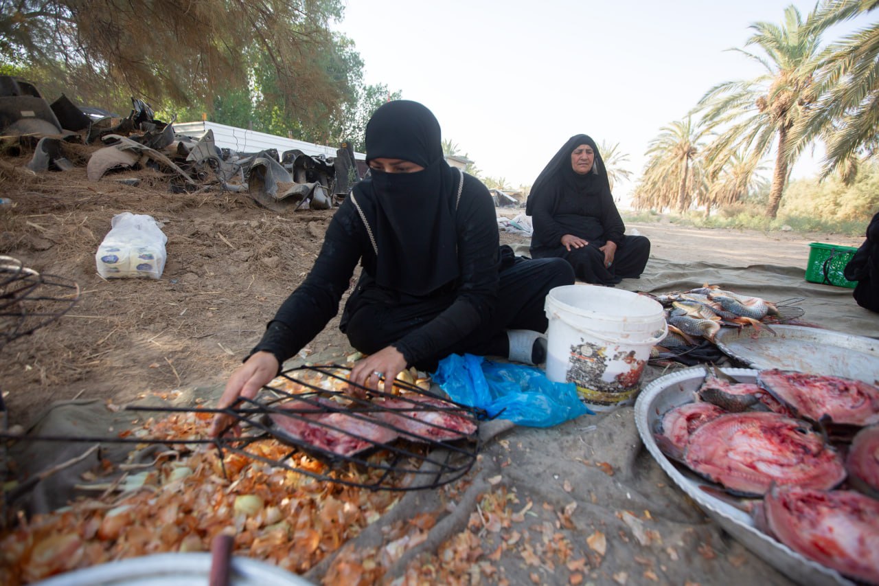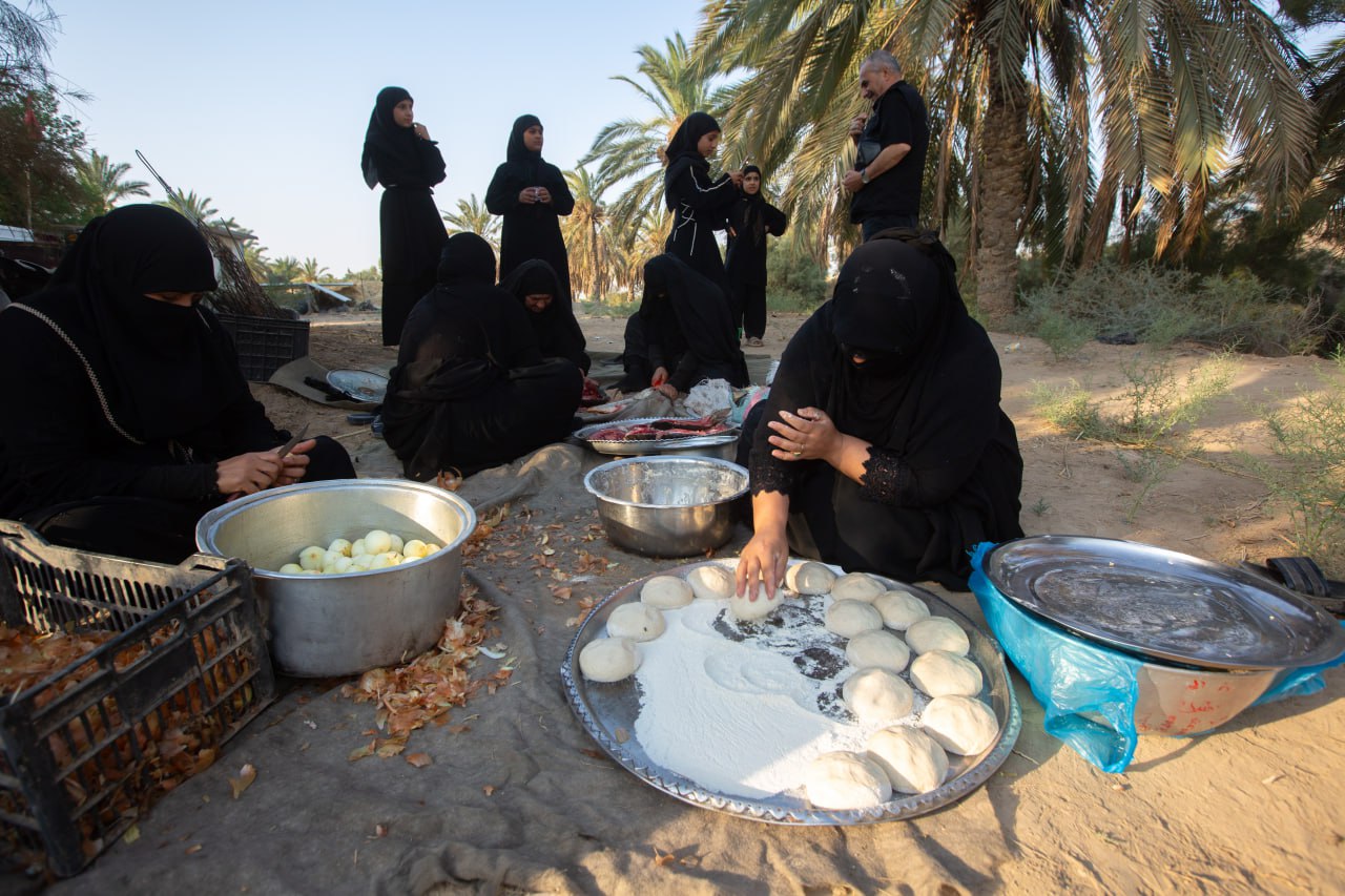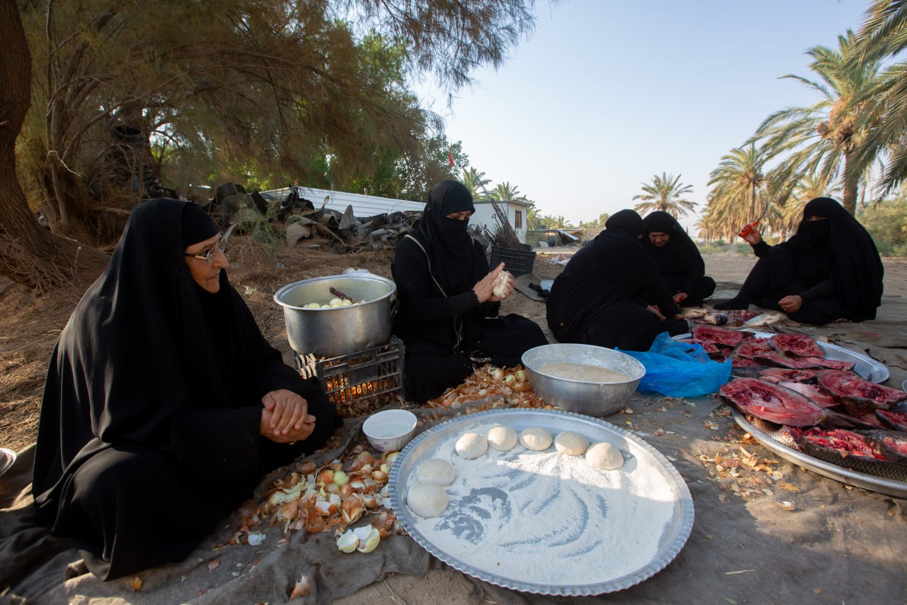 جلست السيدة" حميدة ام ليث" تحيط بها مجموعة من السيدات والفتيات والبنات الصغيرات يصنعن "شنك العجين" ويفتحن جسد السمك لاعداد طعام الغداء للزائرين "السمك، والخبز الحار، والبصل، والطماطة، واوضحت لوكالة نون الخبرية ان" نساء ورجال العشيرة باشروا بالخدمة الحسينية بعد سقوط النظام الدكتاتوري مباشرة حيث كانت مناسبة الاربعينية قريبة، في بيوتنا الشخصية وليس في مواكب الخدمة، وبلا فخر فإن عشيرتنا لم تنقطع عن خدمة الحسين (عليه السلام)، ودأبت على اقامة الشعائر الحسينية حتى في زمن المنع وقتال رجالنا مع ازلام السلطة، وقد احرقوا الكثير من بيوتنا عندما كنا نطبخ للحسين، حيث كانوا يتجسسون علينا ويختبئون بين النخيل والزرع لإلحاق الاذى بنا، وبعد سقوط الطاغية المقبور ونظامه انطلقت الملايين من اهالي البصرة واقضية ذي قار الى كربلاء المقدسة فهرع ابناء العشيرة لتقديم خدمات الطعام والشراب مما يخزنون من "الحصة التموينية"، وما نربيه من الدجاج او الغنم، وما نصيده من اسماك وانفقوا ما في جيوبهم من اموال لتوفير الزاد للسائرين، وفتحوا بيوتهم لإيوائهم ومبيتهم"، مشددة بالقول " يا ما غسلن هذني ايديه هدوم الزوار"، ولاننا بنات عشائر ومضائف لا نعجز عن اعداد الطعام للزائرين، بل هناك من يأتي بعد منتصف الليل بساعات وما ان يقول انه جائع حتى ننهض ونعد له الطعام، ولا نستقبل ضيوفنا في "البراني" او "المضيف بل في اغلب غرف البيت ونبقى في مساحة قليلة لنحتجب عن الزائرين، اما النساء فكنا نستضيفهن معنا داخل بيوتنا كأخواتنا، ومنذ مئات السنين نحن هنا في بيوتنا نخدم الزائرين ورغم قصف الطاغية لبيوتنا بالطائرات والمدافع الا اننا بقينا نخدم ونستضيف الزوار في بيوتنا وزال الظالم ونظامه الدكتاتوري".