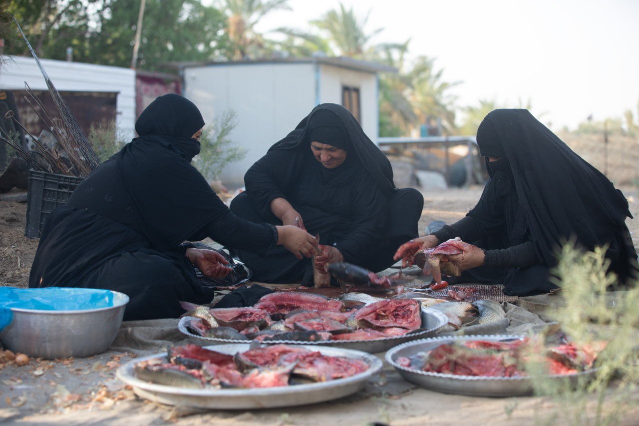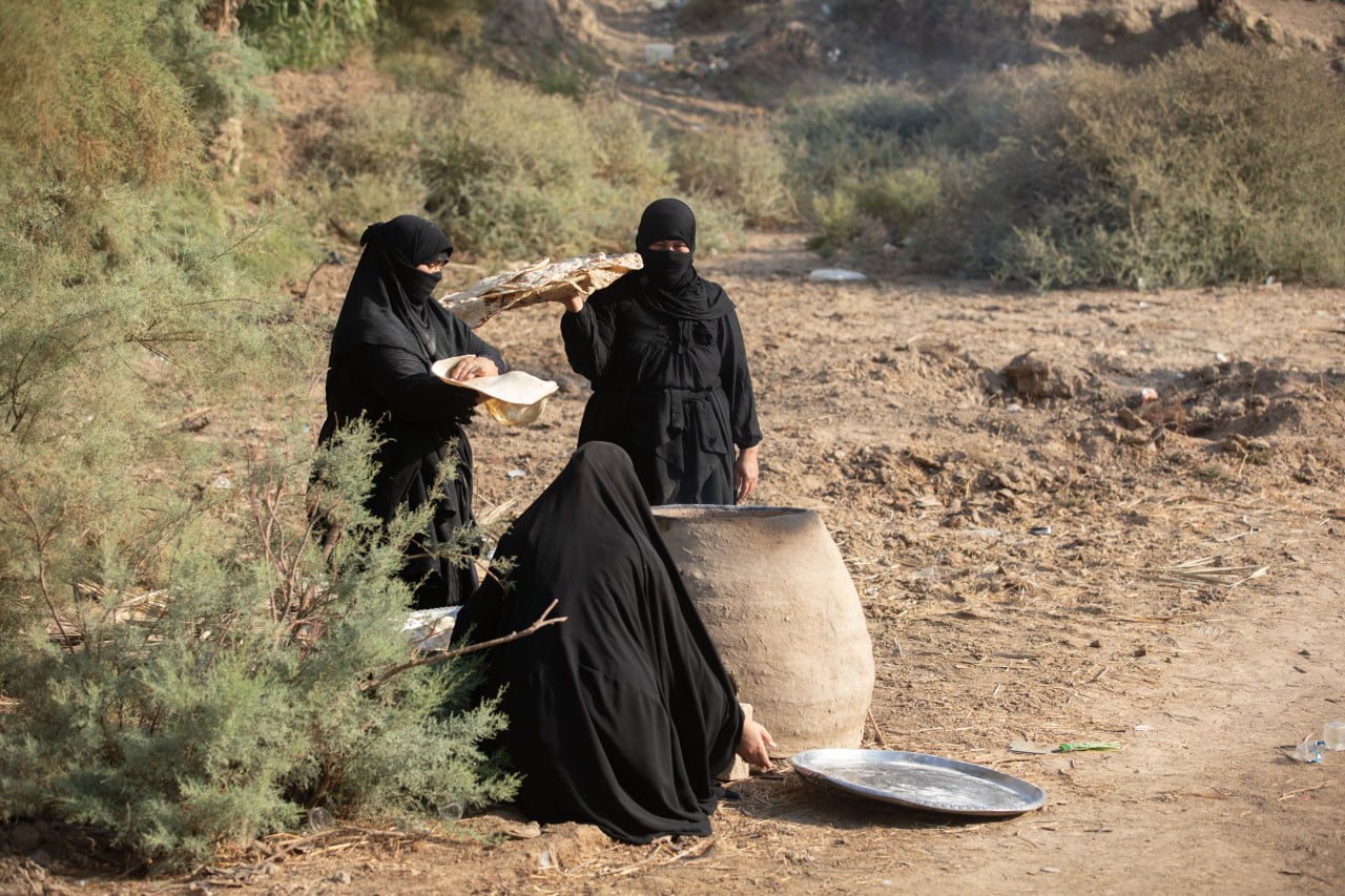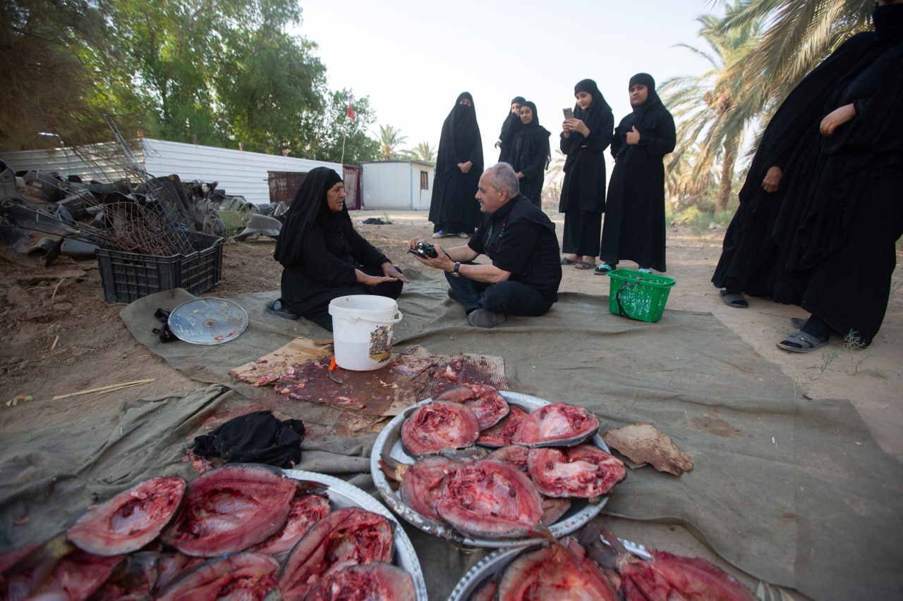 جلست السيدة" حميدة ام ليث" تحيط بها مجموعة من السيدات والفتيات والبنات الصغيرات يصنعن "شنك العجين" ويفتحن جسد السمك لاعداد طعام الغداء للزائرين "السمك، والخبز الحار، والبصل، والطماطة، واوضحت لوكالة نون الخبرية ان" نساء ورجال العشيرة باشروا بالخدمة الحسينية بعد سقوط النظام الدكتاتوري مباشرة حيث كانت مناسبة الاربعينية قريبة، في بيوتنا الشخصية وليس في مواكب الخدمة، وبلا فخر فإن عشيرتنا لم تنقطع عن خدمة الحسين (عليه السلام)، ودأبت على اقامة الشعائر الحسينية حتى في زمن المنع وقتال رجالنا مع ازلام السلطة، وقد احرقوا الكثير من بيوتنا عندما كنا نطبخ للحسين، حيث كانوا يتجسسون علينا ويختبئون بين النخيل والزرع لإلحاق الاذى بنا، وبعد سقوط الطاغية المقبور ونظامه انطلقت الملايين من اهالي البصرة واقضية ذي قار الى كربلاء المقدسة فهرع ابناء العشيرة لتقديم خدمات الطعام والشراب مما يخزنون من "الحصة التموينية"، وما نربيه من الدجاج او الغنم، وما نصيده من اسماك وانفقوا ما في جيوبهم من اموال لتوفير الزاد للسائرين، وفتحوا بيوتهم لإيوائهم ومبيتهم"، مشددة بالقول " يا ما غسلن هذني ايديه هدوم الزوار"، ولاننا بنات عشائر ومضائف لا نعجز عن اعداد الطعام للزائرين، بل هناك من يأتي بعد منتصف الليل بساعات وما ان يقول انه جائع حتى ننهض ونعد له الطعام، ولا نستقبل ضيوفنا في "البراني" او "المضيف بل في اغلب غرف البيت ونبقى في مساحة قليلة لنحتجب عن الزائرين، اما النساء فكنا نستضيفهن معنا داخل بيوتنا كأخواتنا، ومنذ مئات السنين نحن هنا في بيوتنا نخدم الزائرين ورغم قصف الطاغية لبيوتنا بالطائرات والمدافع الا اننا بقينا نخدم ونستضيف الزوار في بيوتنا وزال الظالم ونظامه الدكتاتوري".