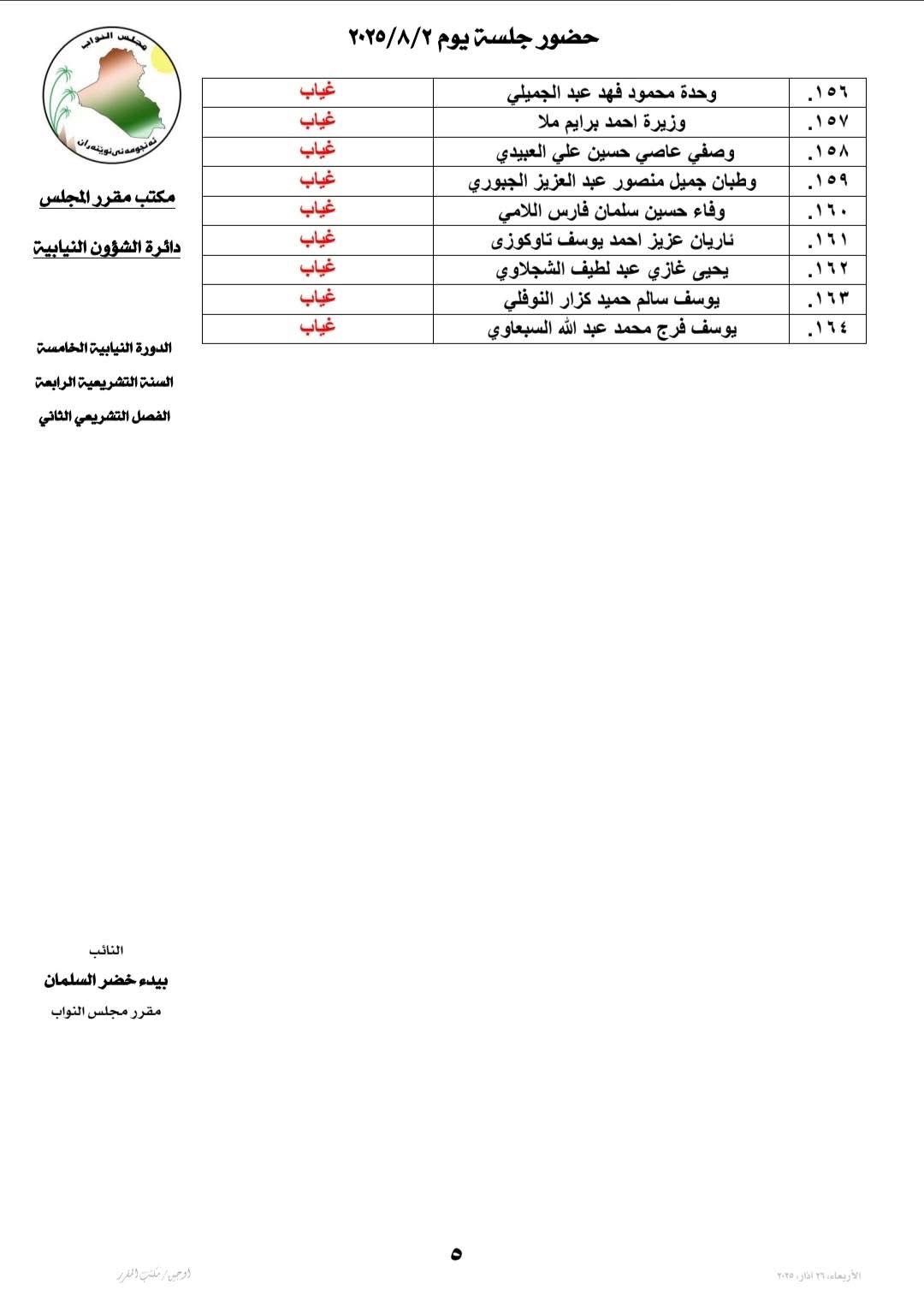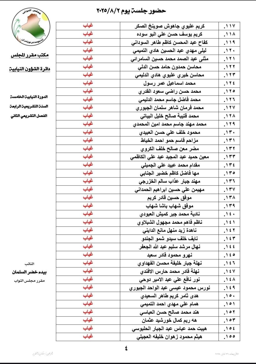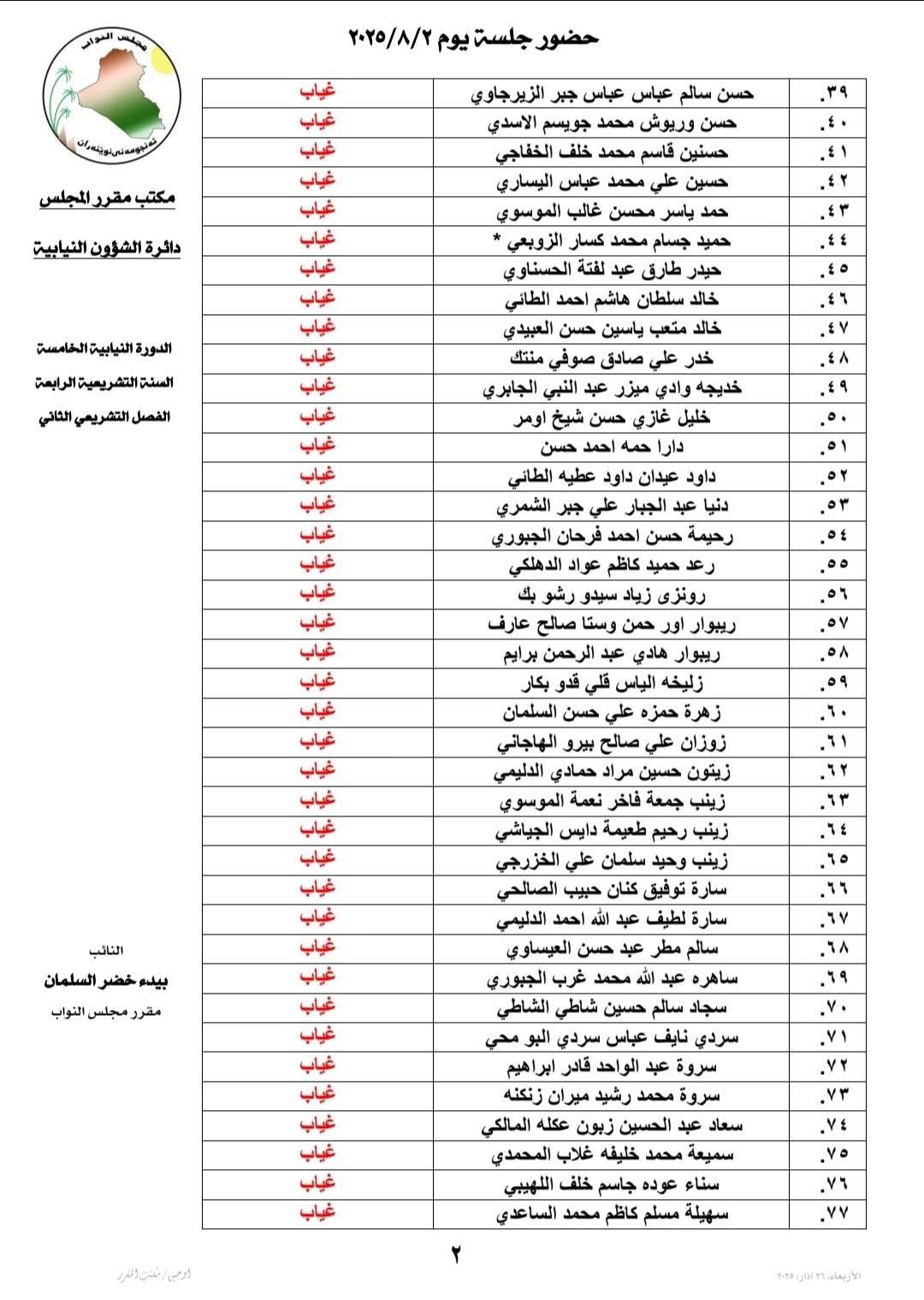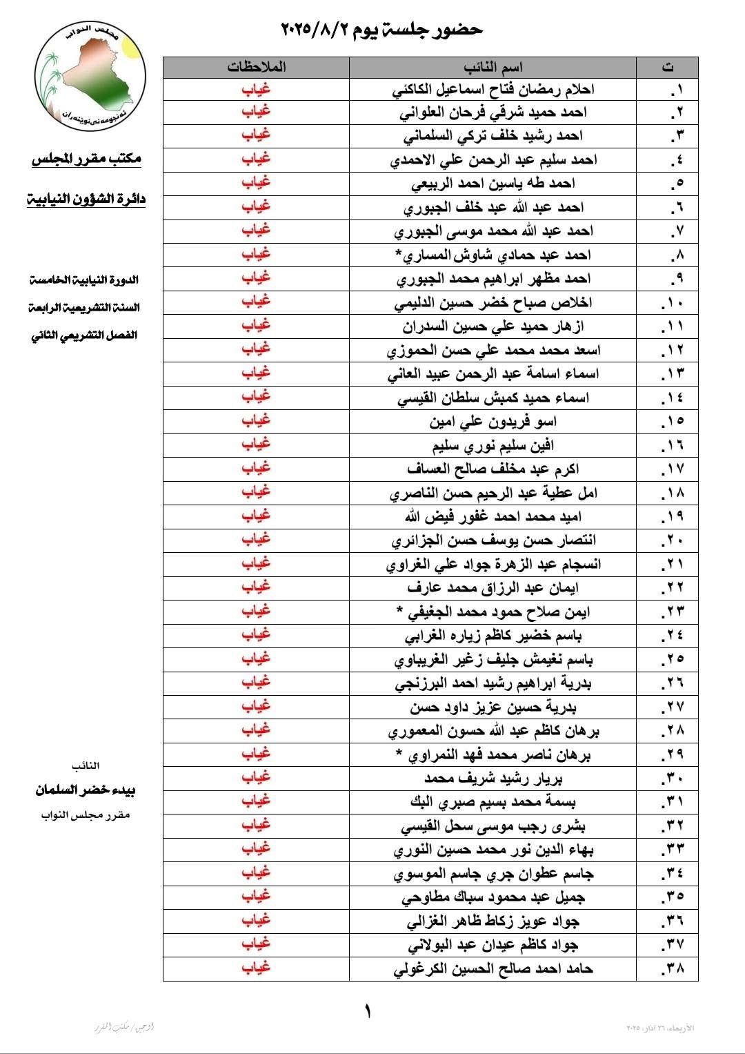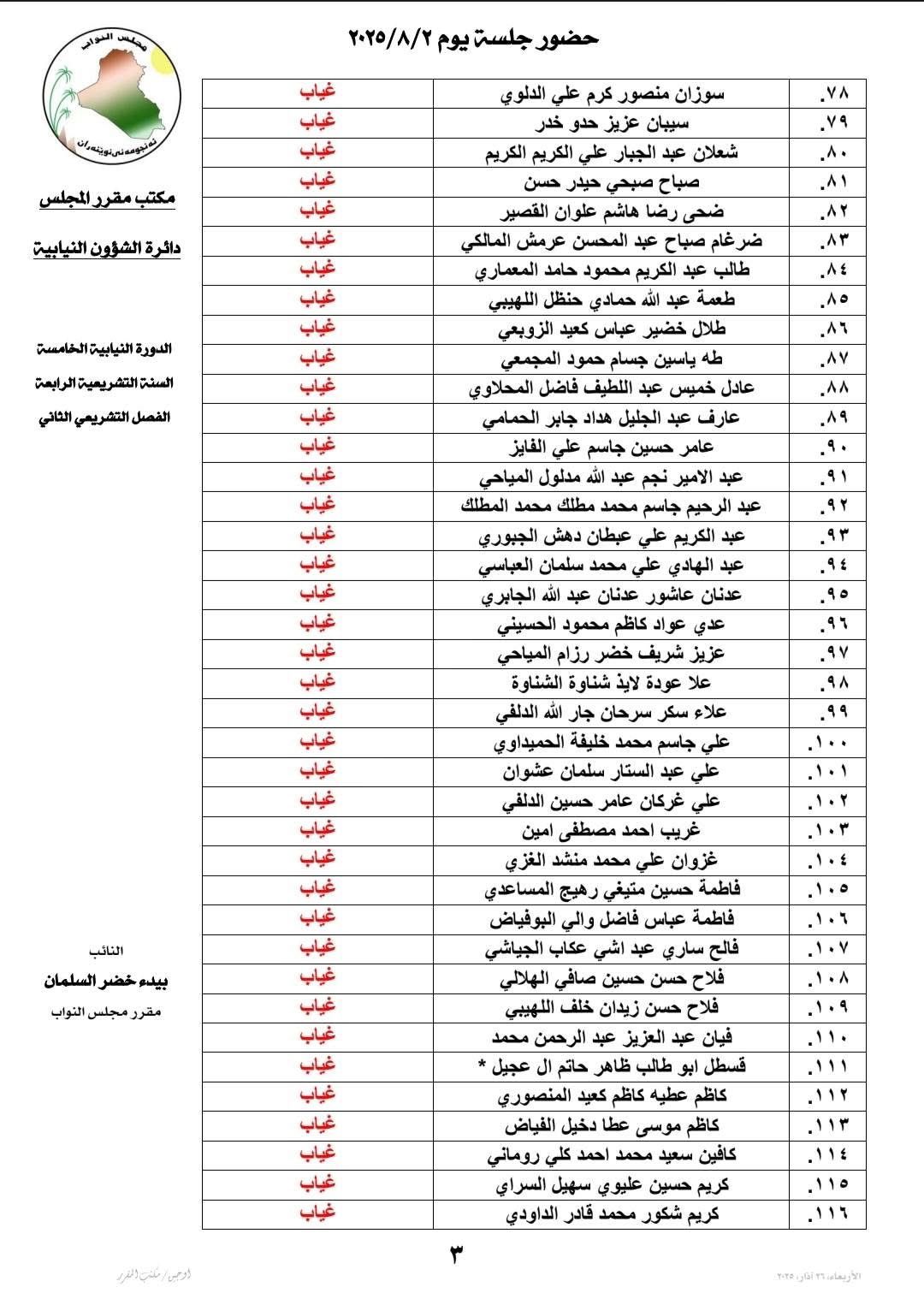 ووجّه النائب الأول لرئيس مجلس النواب العراقي، محسن المندلاوي، اليوم السبت، بنشر أسماء أعضاء المجلس المتغيبين عن جلسة اليوم السبت الموافق 2 آب 2025، مع اتخاذ