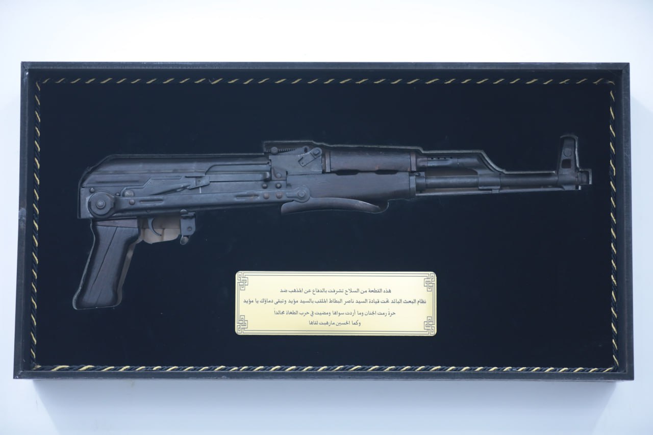 هذا المجاهد كانت ترافقه في معاركه بندقيته الخاصة حتى سمي بها "ابو النص اخمص" هذه البندقية فقدت في المعركة التي جرح بها، عن قصتها يكمل شقيقه الحديث قائلا" كل المعارك والمواجهات التي اشترك بها الشهيد كان يستخدم هذه البندقية الكلاشنكوف "نص اخمص"، وبعد ان جرح ونزف في محاولة اغتيال "علي كيمياوي" فقدت تلك البندقية عام (1991) في ارض المواجهة، وبعد (32) عام زارنا احد رفاقه في سنوات الجهاد والمعركة نفسها والذي خرج سالما منها وهاجر للعيش في "كندا"، وبحث عن عائلتنا حتى وصل الينا واخبرنا عن البندقية وصولات الشهيد "ناصر" بها، وما ان دلنا على مكان وجود البندقية حتى باشرنا بالبحث عن مكان وجودها وتواصلنا مع العائلات التي تسكن قرب ساحة المواجهة، واخبرونا ان البندقية اعتبرت من الغنائم واخذها احد سكان منطقة "ام عنيج" ودفنها واخفاها منذ العام (1991) ولغاية العام (2003) ثم اخرجها وتواصلنا مع العائلة التي احتفظت بها، وعن طريق شخص مفاوض تمكن من اعادتها الينا بعد ان اثبتنا بالدليل واقتنعت تلك العائلة بأنها عائدة لولدنا الشهيد الذي قاتل النظام الدكتاتوري البغيض وسلمت الينا في نهاية العام (2023)".
