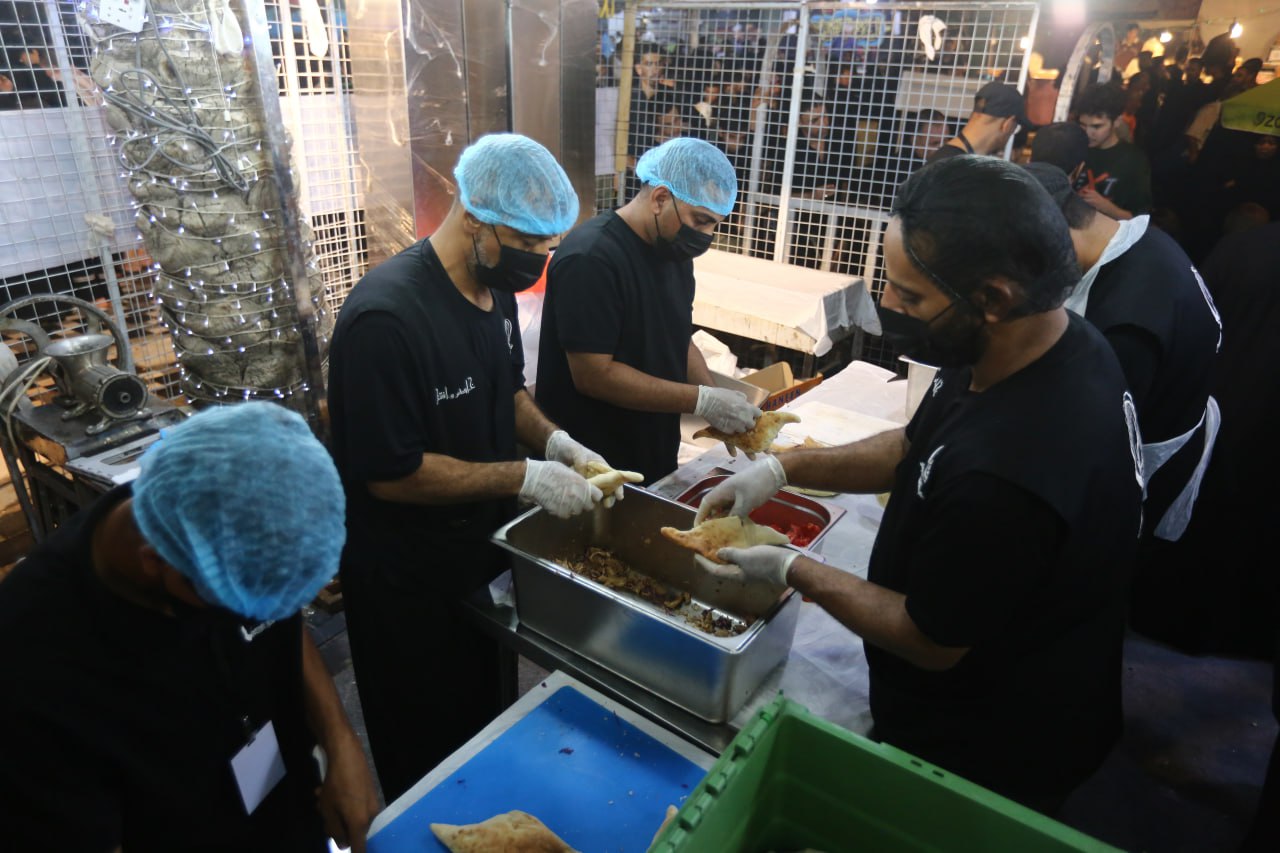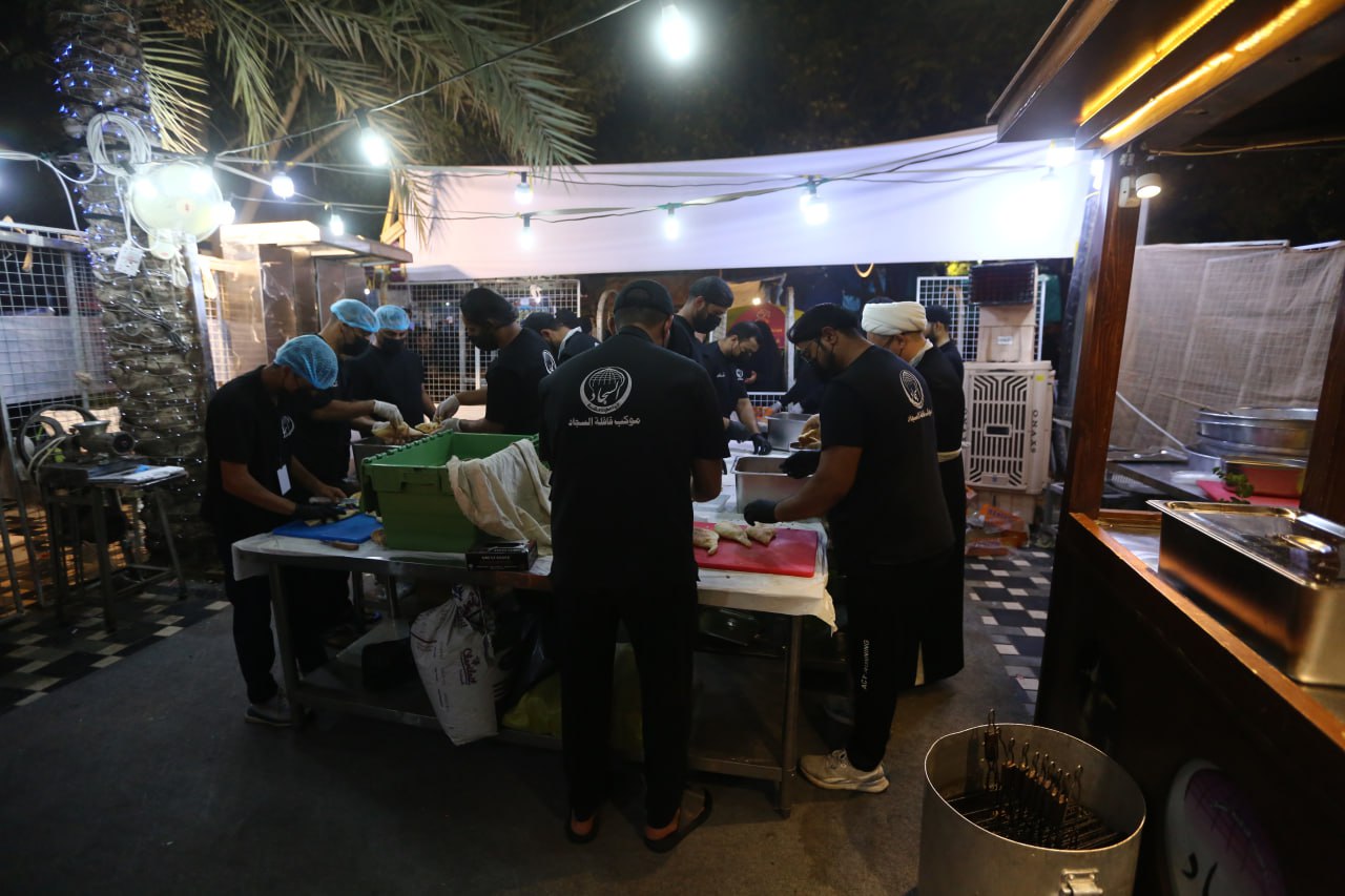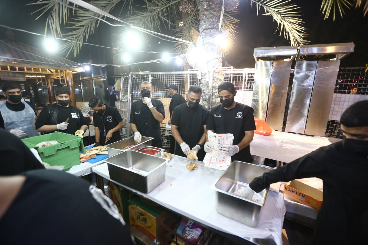 ويلفت النظر "ابو ثائر" الى شعار الموكب الذي يركز كثيرا على النظافة والترتيب والصورة الجميلة ويقول ان" ابرز ما يميز عمل الموكب هو النظافة التي يلتزم بها خدام الموكب بشكل كبير جدا، وبما ان طريقة تقديم الخدمة تعتمد على وجبات العمل فكل وجبة لا تتسلم العمل الا بعد ان تقوم الوجبة التي قبلها بتنظيف مكان العمل بشكل كامل، كما ينفذ الموكب بعد انتهاء الزيارة الاربعينية بحملة تنظيف شاملة لمكان الموكب والمناطق المحيطة به وغسل الشارع والارصفة كما تسلمناها ممن سهل لنا استغلال هذه المساحة"، مشيرا بالقول "لو ان جميع المواكب عملت ما نعمله لخففت الضغط على الدوائر البلدية في المدينة وادامت النظافة، ونقدم من الاكلات الاحسائية اكلة "البروستد" المكونة من قطع الدجاج، وكذلك الطعمية "الفلافل"، والبيض بالتوابل وغيرها من الاكلات، ولدى الخدام جدول بتقديم انواع مختلفة يوميا من الاطعمة مع العصائر والمياه، وكل خادم في الموكب متخصص باعداد وجبة طعام يبدع باعدادها".