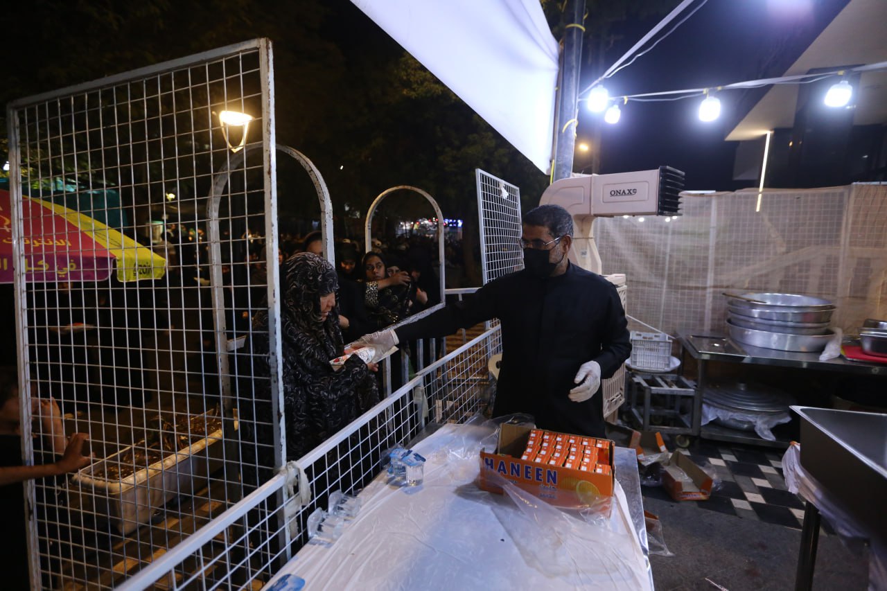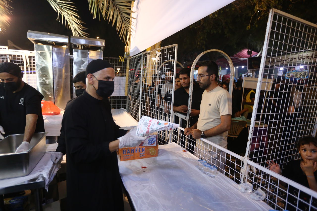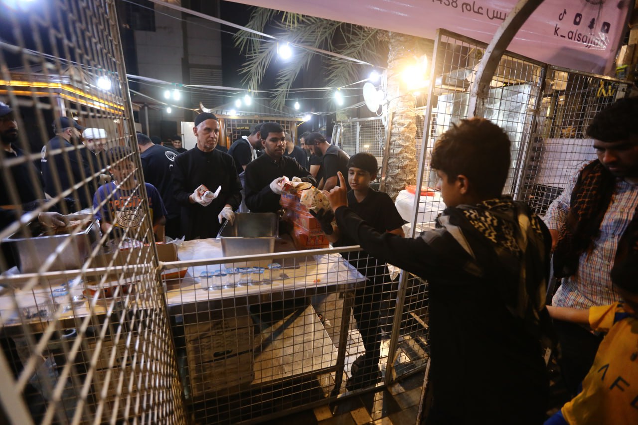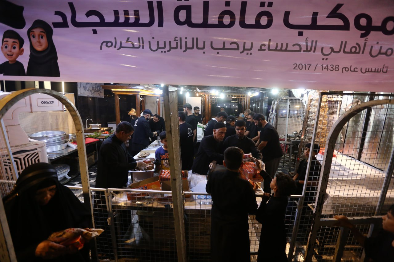 وقف "ابو ثائر" مسؤول موكب "قافلة السجاد" يوعز للعاملين بتقديم الطعام والشراب والاسراع باعداد الوجبات بعد ان حل الليل وزاد زخم الزوار داخل المدينة القديمة، ويقول لوكالة نون الخبرية ان" موكبنا من مدينة الاحساء في المملكة العربية السعودية، بدأت الخدمة فيه داخل مدينة كربلاء القديمة في العام (2017) واقيم على مساحة محدود ويعتمد على مجهودات فردية من الاخوة الزائرين من الاحساء، وتولدت فكرة اقامة هذا الموكب من خلال مشاهداتنا في زياراتنا السابقة التي كنا نأتي بها الى الزيارة الاربعينية لحجم البذل والعطاء والكرم والاطعام والشراب والمبيت والمنام الذي تقدمه المواكب الحسينية وفي مقدمتها المواكب العراقية، ونحن نعرف جيدا ما ورد عن ائمة اهل البيت في عظيم الفضل لمن يطعم زائري ابي عبد الله الحسين (عليه السلام)، ومنها نصب الموكب وانطلقت الخدمة في نفس هذا المكان باربعة اشخاص وتقديم الماء فقط الى ان وصلنا الآن الى التسابق على المشاركة في الخدمة، وحاولنا ان نقدم اطعمة وعصائر واشربة مختلفة عن ما تقدمه باقي المواكب فاعتمدنا الذائقة الاحسائية في اعداد وجبات الطعام وتقديمها، لذلك ترى الاقبال الكبير على تناول اطعمة الموكب لانها تختلف عن ما يقدم في غيره".