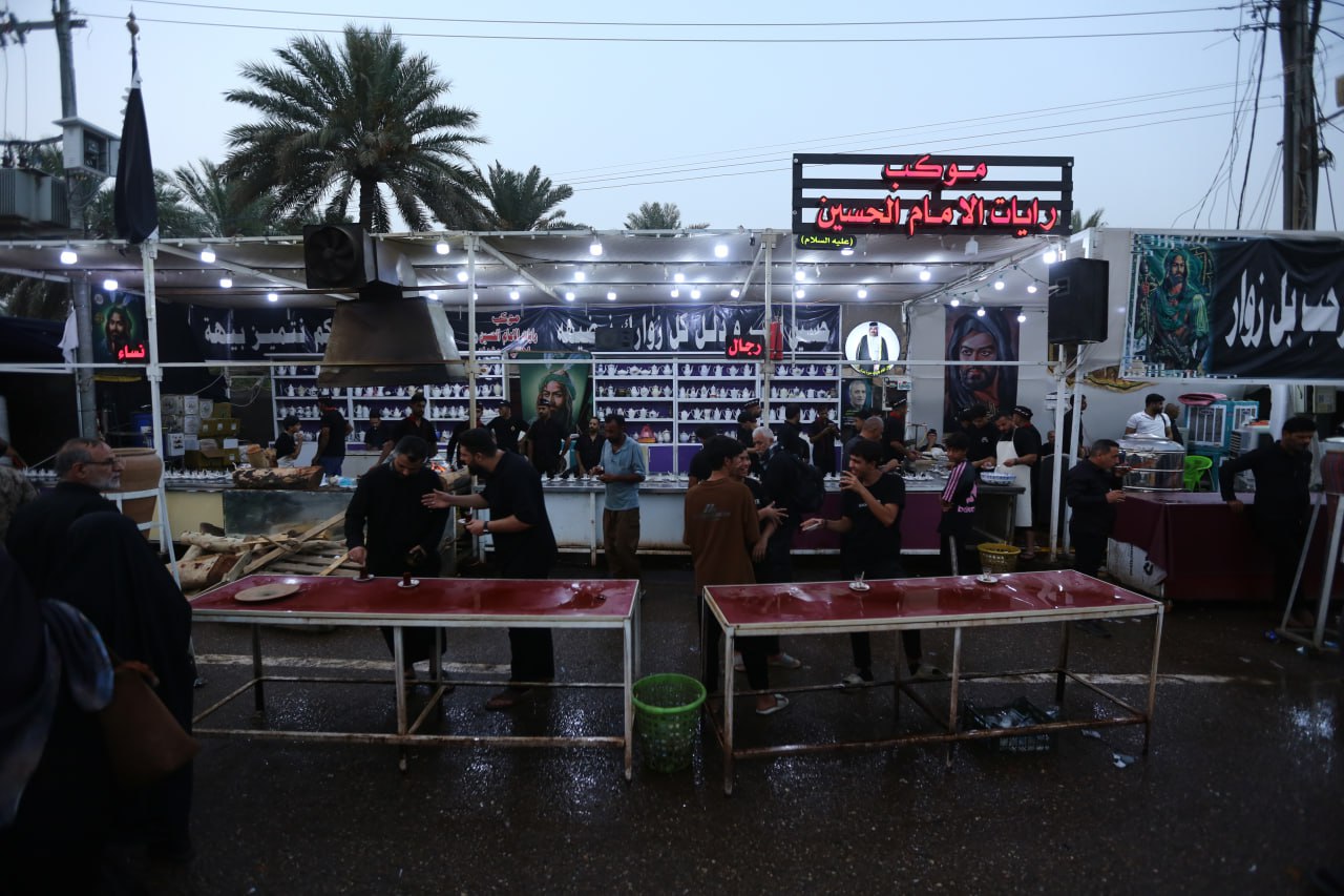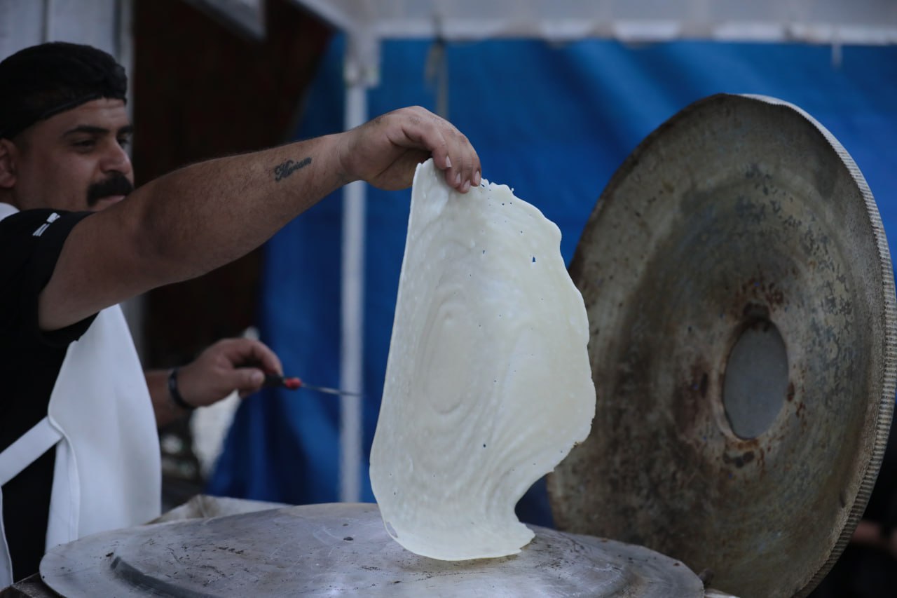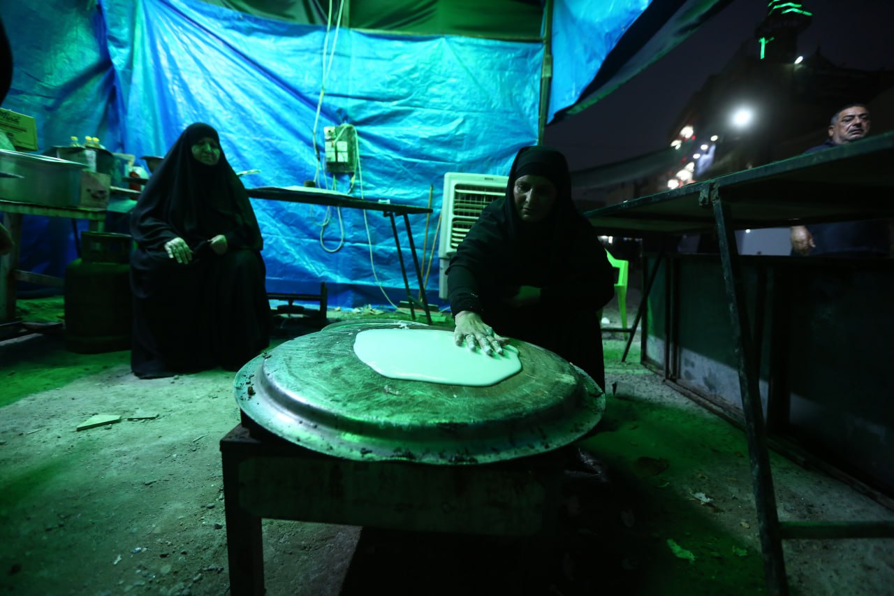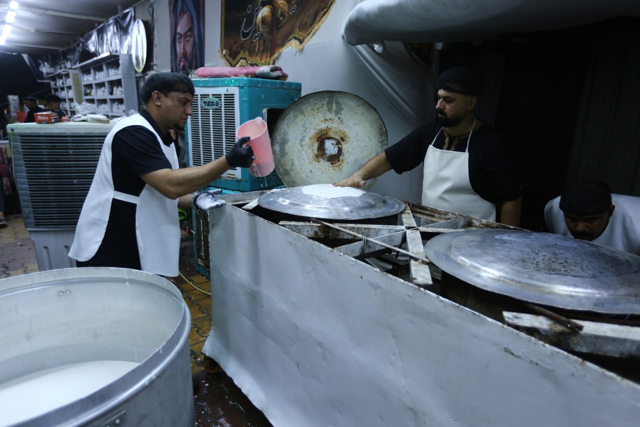 تميز موكب "رايات الامام الحسين" الذي قدم خدامه من منطقة الاورفلي في مدينة الصدر ببغداد بصناعة "خبز السياح" وتقديمه في وجبة الافطار الصباحي للزائرين، بعدما تمرس خدامه منذ سنوات عدة على صناعته، ونصب الافران الخاصة به بطريقة جديدة يقول عنها مسؤول الموكب "كامل خنجر" لوكالة نون الخبرية ان" الموكب بدأ تقديم الخدمة هنا منذ العام (2015) ومنها انطلقت خدمة تقديم "خبز السياح" كونها اكله خفيفة يحبها الزوار وتقدم مع الوجبات السريعة في الشتاء على مدار اليوم، اما في الصيف فتختصر على آخر الليل او وجبة الفطور الصباحي لان درجات الحرارة العالية تجعل الزائر يبحث عن ما يبرد جسده، ولكون هذا الخبز تميزت بصناعته النساء الجنوبيات فكانت معنا في الموكب احدى النساء كبيرات السن تصنعه وعلمت هؤلاء الشباب الذين تراهم امامك على صناعته عندما كانت اعمارهم صغيرة ويساعدونها، ويعتمدون على ماكنة العجين "العجانة" لاعداده، وكان يخبز على "طاوات" صغيرة، "الصاج" توضع على ثلاث ركائز على الارض، ويوضع تحتها الحطب ويجلس الخدام على الارض لاعداد الخبز، وقمنا بتصنيع هذه الافران ليتمكن الخدام من صناعة الخبز بالغاز السائل بدل الحطب ووقوفا بدل الجلوس وفي فصل الشتاء نقدم هذا الخبز من خلال تشغيل (6 ــ 8) افران لتوفير اكبر عدد ممكن من خبز السياح للزائرين، حيث تصل كمية الطحين المستعملة في صناعة الخبر الى طن و(500) كيلوغرام خلال (12) يوما، اما في الصيف فالعدد قليل وقد يكون كيس واحد يوميا، وكنا في بداية الامر ثلاثة مواكب في شارع السيدة "زينب" (عليها السلام) القادم من قضاء الحسينية ونحن من بدأنا تقديم الخبز ثم لحقتنا باقي المواكب بعد ان اصبح عليها اقبال كبير، وحاليا نقدمه من صلاة الفجر الى ساعات الصباح الاولى".