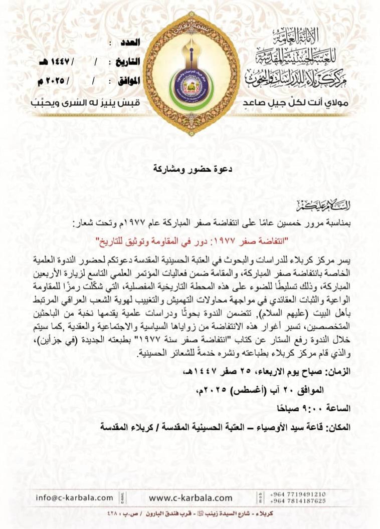 عنوانُ السِّفرِ [إِنتفاضةُ النَّجَفُ الأَشرفِ الصَّفَريَّةِ] والذي صدرَ بطبعةٍ جديدةٍ هذا العام في الذِّكرى الخمسين للإِنتفاضةِ عن [مَركز كربلاء للدِّراساتِ والبحوثِ] في العتبةِ الحُسينيَّةِ المُقدَّسةِ والذي يُقيمُ [المركز] بهذِهِ المُناسبةِ ندوةً بعنوانِ [إِنتفاضةُ صفَر ١٩٧٧… دورٌ في المُقاومةِ وتَوثيقٌ للتَّاريخِ] يَوم الأَربعاء [٢٥ صفَر ١٤٤٧ هـ المُوافق ٢٠ آب (أُغسطُس) ٢٠٢٥ م السَّاعة [٩] صباحاً على قاعةِ سيِّد الأَوصياء في العتبةِ الحُسينيَّةُ المُقدَّسةِ.