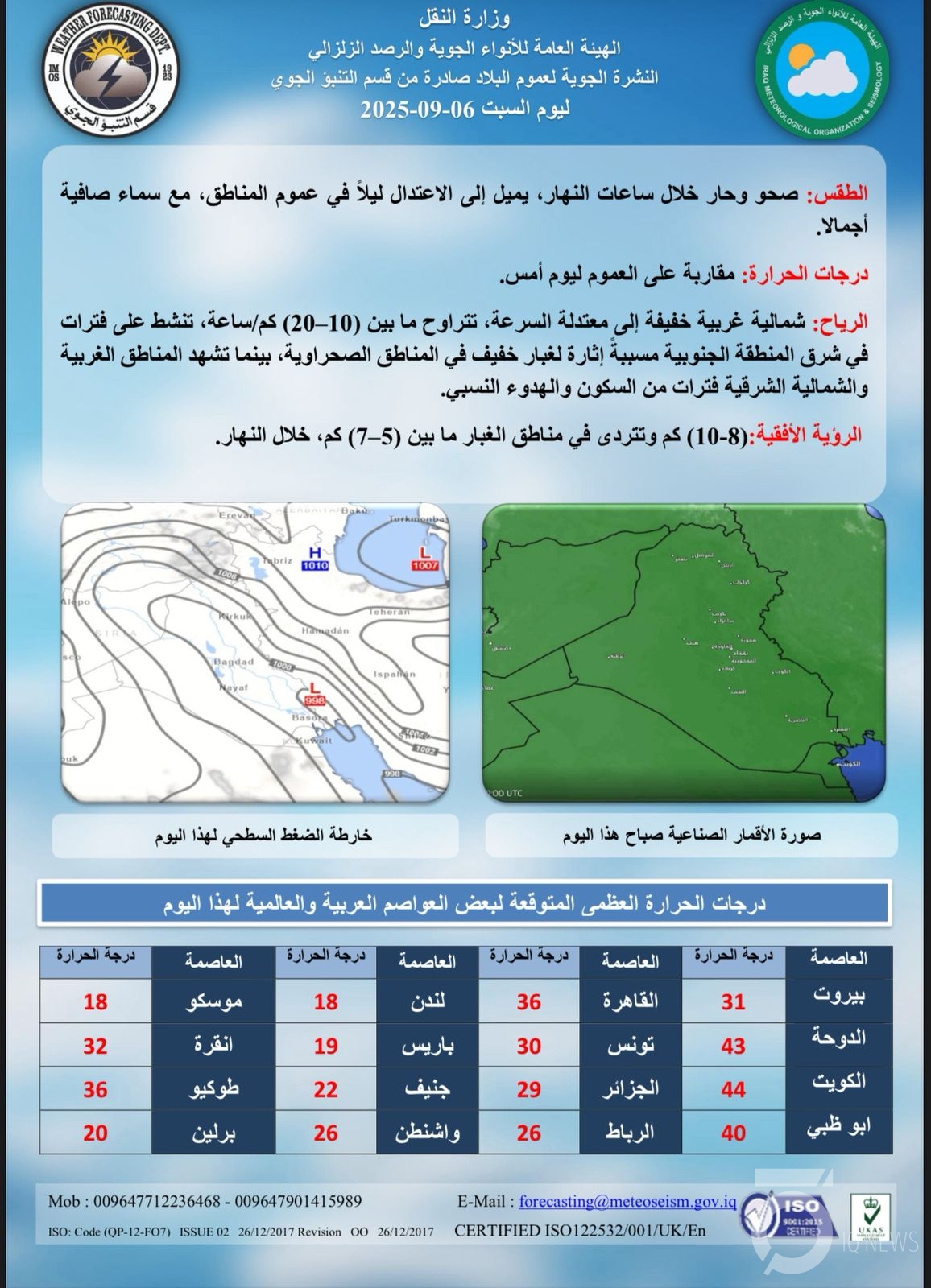 الأنواء الجوية: المنخفض الحراري يودع العراق السبت 06 ايلول 2025 سياسية 675 مشاهدة الأنواء الجوية: المنخفض الحراري يودع العراق أعلنت هيئة الأنواء الجوية، اليوم السبت، عن تفاصيل حالة الطقس في البلاد للأيام المقبلة، فيما توقعت تصاعداً للغبار وتبايناً في درجات الحرارة. التعليقات (0) لا توجد تعليقات بعد. كن أول من يعلق! اسمك البريد الإلكتروني تعليق إرسال التعليق تعليقاتكم والموضوعات الأكثر تداولاً أكثر المواضيع قراءة عرض الكل الأكثر قراءة اليوم الأسبوع الشهر سنة 1 إقتصادية أسعار صرف الدولار أمام الدينار العراقي اليوم الأحد 973 مشاهدة --منذ 16 ساعة 2 إقتصادية أسعار صرف الدولار في العراق مع إغلاق الأسواق مساء الأحد 862 مشاهدة --منذ 12 ساعة 3 تقارير بينها (21) مادة غذائية.. وفد اغاثة العتبة الحسينية يوزع المساعدات على السوريين النازحين في لبنان 494 مشاهدة --منذ 18 ساعة 4 سياسية الهيئة القضائية تستبعد صاحب أعلى الأصوات في الموصل.. نجم الجبوري خارج البرلمان 456 مشاهدة --منذ 14 ساعة 5 سياسية انقلاب عسكري يهزّ دولة افريقية ويطيح برئيسها 443 مشاهدة --منذ 14 ساعة 1 إقتصادية أسعار صرف الدولار مع إغلاق السوق مساء الأربعاء في العراق 2366 مشاهدة --الأربعاء 03 كانون الأول 2025 2 إقتصادية تعرف على أسعار صرف الدولار أمام الدينار العراقي 1971 مشاهدة --الخميس 04 كانون الأول 2025 3 إقتصادية ارتفاع أسعار صرف الدولار في العراق 1580 مشاهدة --السبت 06 كانون الأول 2025 4 إقتصادية الدولار يواصل ارتفاعه أمام الدينار العراقي 1549 مشاهدة --الثلاثاء 02 كانون الأول 2025 1 سياسية نتائج اولية :الفائزون في مقاعد مجلس النواب بكربلاء المقدسة 8495 مشاهدة --الأربعاء 12 تشرين الثاني 2025 2 سياسية بالارقام: النتائج الأولية للتصويت بالانتخابات النيابية في محافظة نينوى 6666 مشاهدة --الثلاثاء 11 تشرين الثاني 2025 3 اخبار محلية اسماء جديدة تشكل 11 فائز بانتخابات 2025 في محافظة كربلاء المقدسة 4328 مشاهدة --الخميس 13 تشرين الثاني 2025 4 سياسية مجلس بغداد يُفعّل نظام التوصيل المنزلي للنفط الأبيض 4052 مشاهدة --الخميس 20 تشرين الثاني 2025 5 سياسية وكالة نون تنشر النتائج الاولية للقوائم الانتخابية الفائزة في محافظة واسط 3800 مشاهدة --الأربعاء 12 تشرين الثاني 2025 6 منوعة طقس العراق.. أمطار رعدية وانخفاض في درجات الحرارة 3653 مشاهدة --الجمعة 14 تشرين الثاني 2025 1 اخبار محلية خلال زيارته لمشروع صحن العقيلة.. ممثل السيد السيستاني يوعز بتخصيص مساحة (5) الاف متر على اسطح البنايات للزائرين 18415 مشاهدة --السبت 13 ايلول 2025 2 سياسية مكتب السيد السيستاني ينشر إمساكيات شهر رمضان المبارك للمحافظات العراقية لعام 1446هـ (2025م) 13665 مشاهدة --الأربعاء 19 شباط 2025 3 لقاءات *محمد الصواف: عدسة توثق الحقيقة وتنقل قصص الإنسانية في قلب الأزمات* 12328 مشاهدة --الأحد 30 آذار 2025 4 لقاءات منها الخاصة وفوق الكبرى والكبرى.. حيدر زيني.. طبيب أجرى (51) عملية في (28) ساعة متواصلة بمستشفى السفير 10885 مشاهدة --الثلاثاء 27 آيار 2025 5 اخبار محلية كربلاء تحدد تسعيرة "أمبير" المولدات الأهلية لشهر حزيران 2025 9528 مشاهدة --الثلاثاء 27 آيار 2025 6 تحقيقات بينَ زَخَّاتِ الرَّصاصِ وَدُموعِ الأهلِ.. قِصةُ شهيدٍ كَتبَتْ كربلاءُ خاتِمَتَهُ 8970 مشاهدة --الأربعاء 02 نيسان 2025 آخر التعليقات 1 Carlosalmof التعليق : We buy household appliances in St. Petersburg and the Leningrad Region продать спб. We buy ... الموضوع : سندات مالية جديدة.. الفائدة المصرفية تحبط خطط الحكومة لسد العجز 2 احمد علي اسماعيل الغوار التعليق : بسم الله حفظ الله الدكتور شاكر حسين دمدوم الشطري و دمتم لكل خير وبركة من ... الموضوع : قراءة في كتاب تاريخ الشطرة خلال العهد العثماني دراسة.د . شاكر الشطري 3 احمد علي اسماعيل الغوار التعليق : بسم الله حفظ الله الدكتور شاكر حسين دمدوم الشطري و دمتم لكل خير وبركة من ... الموضوع : قراءة في كتاب تاريخ الشطرة خلال العهد العثماني دراسة.د . شاكر الشطري 4 علي حمزه التعليق : السلام عليكم ... الموضوع : مدارس التعليم المسرع: السماح