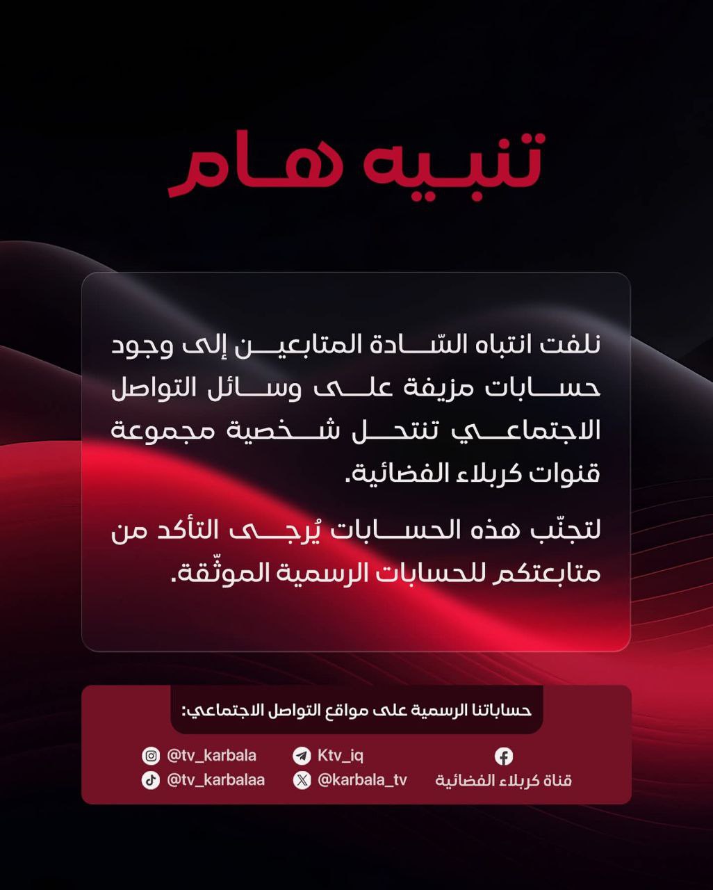 أعلنت قناة كربلاء الفضائية ان جهات مجهولة قامت بفتح حسابات مزورة باسم القناة وان إدارة القناة ستقوم بمتابعة هذا الامر قانونيا