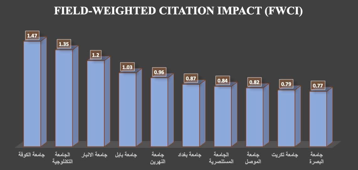 وأظهرت الإحصائيات، التي جمعها ودققها الأستاذ المساعد الدكتور عمر فلاح حسن، المساعد العلمي في جامعة الناجي، أن معدل FWCI لجامعة الكوفة بلغ 1.47، ما يعني أن أبحاث الجامعة حظيت بنسبة استشهاد أعلى من المتوسط العالمي بنسبة 47%، ويُعد هذا الرقم مؤشرًا واضحًا على جودة الأبحاث العلمية وتركيز الجامعة على إنتاج أبحاث ذات تأثير عالمي.