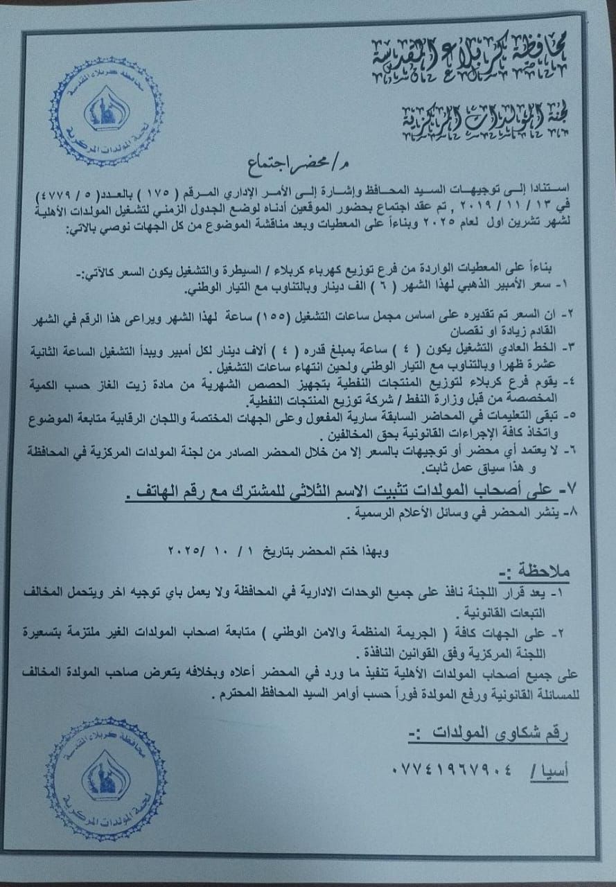 وثيقة.. كربلاء تحدد تسعيرة أمبير المولدات الأهلية لشهر تشرين الأول 2025 الخميس 02 تشرين الاول 2025 اخبار محلية 1,281 مشاهدة وثيقة.. كربلاء تحدد تسعيرة أمبير المولدات الأهلية لشهر تشرين الأول 2025 حددت لجنة المولدات المركزية في محافظة كربلاء المقدسة، الخميس، سعر "أمبير" المولدات الأهلية لشهر تشرين الأول الجاري. وبحسب اللجنة، فإن سعر الأمبير الذهبي يبلغ 6000 دينار، والتشغيل يكون بالتناوب مع التيار الوطني. فيما حددت اللجنة مبلغ 4000 دينار للأمبير العادي، مقابل 4 ساعات من الكهرباء يومياً. التعليقات (0) لا توجد تعليقات بعد. كن أول من يعلق! اسمك البريد الإلكتروني تعليق إرسال التعليق تعليقاتكم والموضوعات الأكثر تداولاً أكثر المواضيع قراءة عرض الكل الأكثر قراءة اليوم الأسبوع الشهر سنة 1 إقتصادية تعرف على أسعار صرف الدولار أمام الدينار العراقي 1667 مشاهدة --منذ 18 ساعة 2 إقتصادية الدولار يرتفع مع إغلاق الأسواق في العراق 901 مشاهدة --منذ 16 ساعة 3 سياسية ضجة بمواقع التواصل بعد نشر الوقائع العراقية قرارات تصنف حزب الله والحوثيين "منظمات ارهابية" 475 مشاهدة --منذ 21 ساعة 4 اخبار محلية يباشر بتنفيذه في (27) رجب.. ممثل السيستاني يطلع على تصاميم اكبر صحون التوسعة في العتبة الحسينية 426 مشاهدة --منذ 13 ساعة 5 سياسية العراق.. التحقيق باستهداف حقل خور مور يتوصل لأسماء منفذي الهجوم 417 مشاهدة --منذ 23 ساعة 1 إقتصادية مع إغلاق السوق.. تعرف على أسعار صرف الدولار في العراق 2156 مشاهدة --السبت 29 تشرين الثاني 2025 2 إقتصادية ارتفاع أسعار صرف الدولار الأمريكي أمام الدينار العراقي 2041 مشاهدة --السبت 29 تشرين الثاني 2025 3 اخبار محلية تخفيضات كبيرة لمدة اسبوعين .. مستشفى الامام زين العابدين (ع) في كربلاء يطلق مبادرة (كوثر العصمة) الطبية 1920 مشاهدة --الجمعة 28 تشرين الثاني 2025 4 إقتصادية أسعار صرف الدولار مع إغلاق السوق مساء الأربعاء في العراق 1730 مشاهدة --الأربعاء 03 كانون الأول 2025 1 سياسية نتائج اولية :الفائزون في مقاعد مجلس النواب بكربلاء المقدسة 8391 مشاهدة --الأربعاء 12 تشرين الثاني 2025 2 سياسية بالارقام: النتائج الأولية للتصويت بالانتخابات النيابية في محافظة نينوى 6545 مشاهدة --الثلاثاء 11 تشرين الثاني 2025 3 اخبار محلية اسماء جديدة تشكل 11 فائز بانتخابات 2025 في محافظة كربلاء المقدسة 4233 مشاهدة --الخميس 13 تشرين الثاني 2025 4 سياسية مجلس بغداد يُفعّل نظام التوصيل المنزلي للنفط الأبيض 3960 مشاهدة --الخميس 20 تشرين الثاني 2025 5 سياسية وكالة نون تنشر النتائج الاولية للقوائم الانتخابية الفائزة في محافظة واسط 3722 مشاهدة --الأربعاء 12 تشرين الثاني 2025 6 منوعة طقس العراق.. أمطار رعدية وانخفاض في درجات الحرارة 3550 مشاهدة --الجمعة 14 تشرين الثاني 2025 1 اخبار محلية خلال زيارته لمشروع صحن العقيلة.. ممثل السيد السيستاني يوعز بتخصيص مساحة (5) الاف متر على اسطح البنايات للزائرين 18319 مشاهدة --السبت 13 ايلول 2025 2 سياسية مكتب السيد السيستاني ينشر إمساكيات شهر رمضان المبارك للمحافظات العراقية لعام 1446هـ (2025م) 13580 مشاهدة --الأربعاء 19 شباط 2025 3 لقاءات *محمد الصواف: عدسة توثق الحقيقة وتنقل قصص الإنسانية في قلب الأزمات* 12248 مشاهدة --الأحد 30 آذار 2025 4 لقاءات منها الخاصة وفوق الكبرى والكبرى.. حيدر زيني.. طبيب أجرى (51) عملية في (28) ساعة متواصلة بمستشفى السفير 10783 مشاهدة --الثلاثاء 27 آيار 2025 5 اخبار محلية كربلاء تحدد تسعيرة "أمبير" المولدات الأهلية لشهر حزيران 2025 9453 مشاهدة --الثلاثاء 27 آيار 2025 6 تحقيقات بينَ زَخَّاتِ الرَّصاصِ وَدُموعِ الأهلِ.. قِصةُ شهيدٍ كَتبَتْ كربلاءُ خاتِمَتَهُ 8894 مشاهدة --الأربعاء 02 نيسان 2025 آخر التعليقات 1 محمد فارس ريان التعليق : الخيانة لها ناسها ... الموضوع : القصة الكاملة لعملية اعتقال طه ياسين رمضان "الجزراوي" 2 محمد فارس ريان التعليق : الخيانة لها ناسها ... الموضوع : القصة الكاملة لعملية اعتقال طه ياسين رمضان "الجزراوي" 3 RonaldNet التعليق : Ребята, подскажите, кто как решал проблему, 