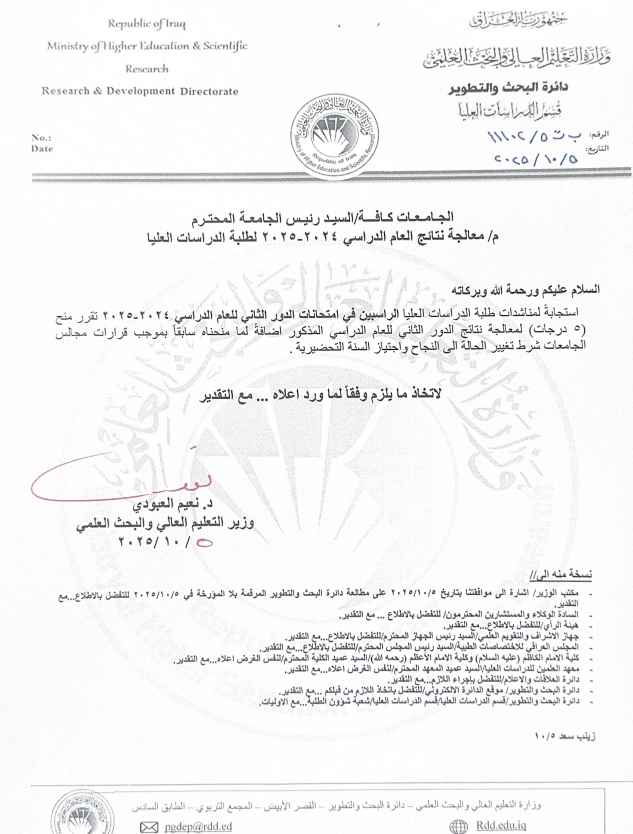 وافق وزير التعليم العالي، نعيم العبودي، اليوم الأحد، على منح 5 درجات معالجة لطلبة الدراسات العليا الراسبين بالدور الثاني.