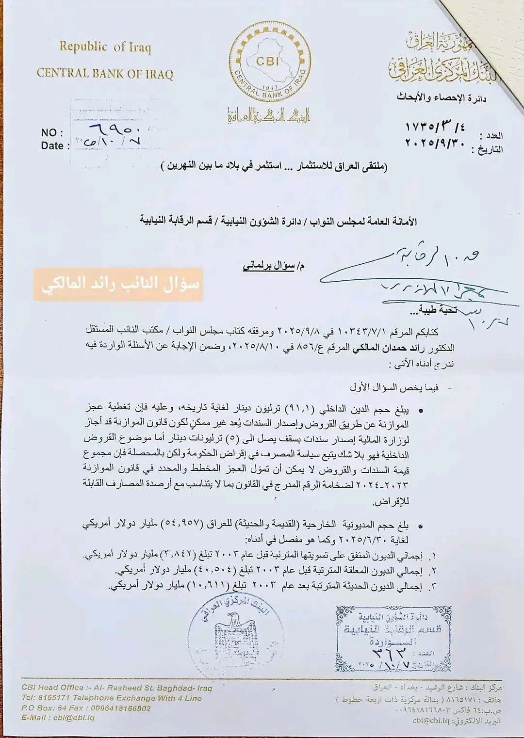 ونقل المالكي في بيان أصدره اليوم السبت عن العلاق قوله، إن ديون العراق الداخلية ارتفعت الى 91 تريليون دينار، والدين الخارجي بلغ 54 مليار دولار .