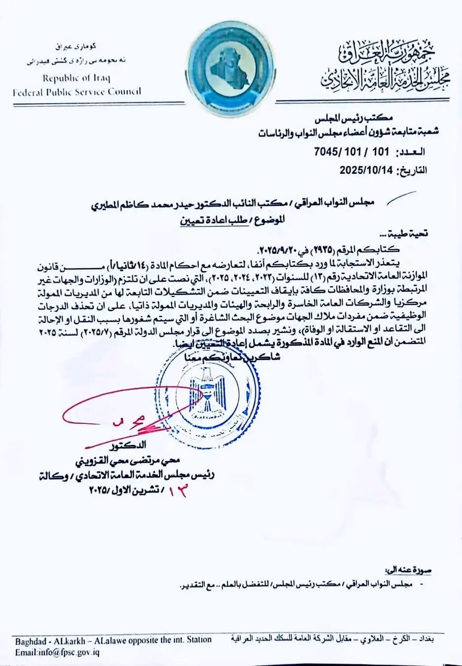 أعلن رئيس مجلس الخدمة الاتحادي، محي مرتضى القزويني، عن إيقاف جميع التعيينات في مفاصل الدولة.