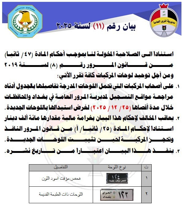 وقالت المديرية في بيان، إنه "استناداً إلى الصلاحيات المخولة إلينا بموجب أحكام المادة 47/ ثانياً من قانون المرور رقم 8 لسنة 2019 ومن أجل توحيد لوحات المركبات كافة تقرر على أصحاب المركبات التي تحمل اللوحات المدرجة تفاصيلها بالجدول أدناه مراجعة مواقع التسجيل لمديرية المرور العامة في بغداد والمحافظات خلال مدة أقصاها 25 كانون الأول 2025 لغرض استبدالها باللوحات الجديدة".