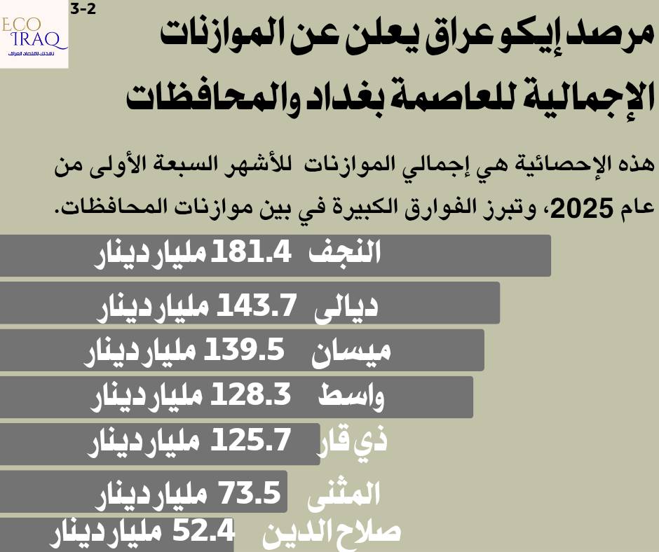 وبيّن أن "أدنى المحافظات إنفاقًا استثماريًا كانت صلاح الدين بصفر إنفاق، تلتها المثنى بـ 30.2 مليار دينار، وذي قار بـ 38.2 مليار دينار"، لافتاً إلى أن "بعض المحافظات أظهرت مؤشرات على تنمية اقتصادية متوازنة تجمع بين النفقات التشغيلية والمشاريع الجديدة، وهي: ميسان: موازنة استثمارية قريبة من الجارية، والنجف: توازن نسبي بين التشغيل والتنمية، وبغداد: استثمار مرتفع يعزز موقعها كمركز اقتصادي رئيسي".