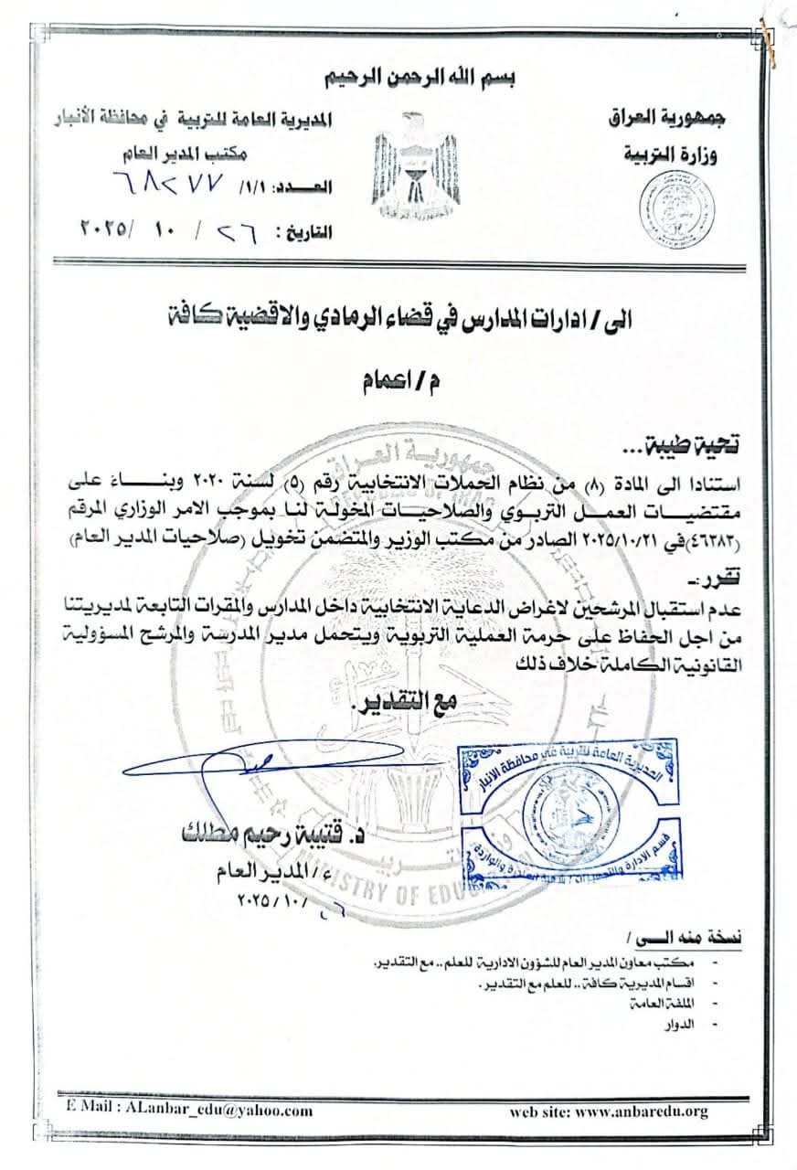 تربية الأنبار تمنع استقبال المرشحين في المدارس والمقرات التابعة لها
