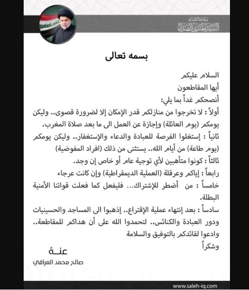 وجه زعيم التيار الوطني الشيعي،السيد مقتدى الصدر، اليوم الإثنين، رسالة إلى المقاطعين للانتخابات.