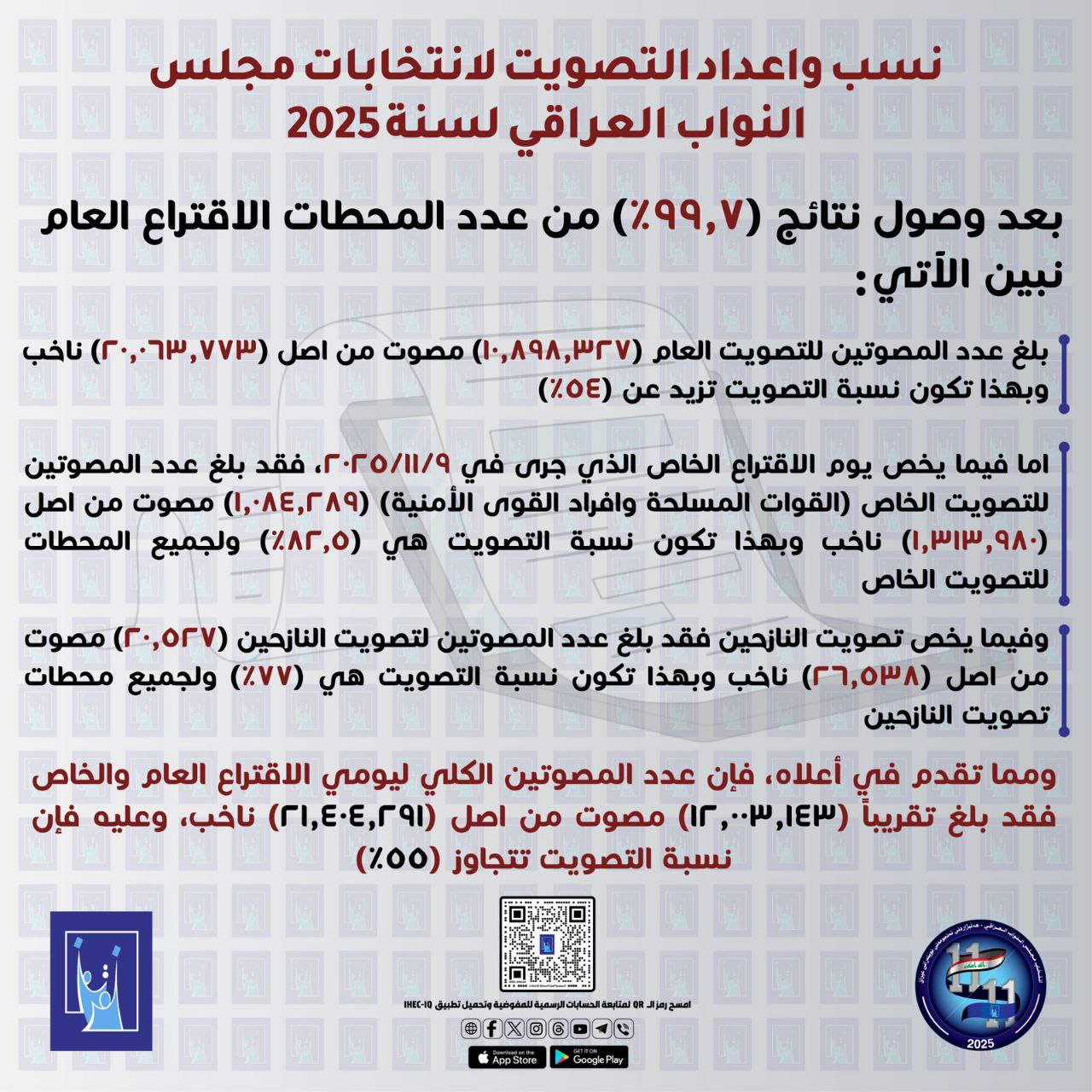 أعلنت المفوضية العليا المستقلة للانتخابات، اليوم الثلاثاء، أن نسبة المصوتين في الاقتراعين العام والخاص لانتخابات مجلس النواب تزيد عن 55%، مبينة أن عدد المشاركين بالاقتراعين الخاص والعام بلغ 12003143 ناخباً.